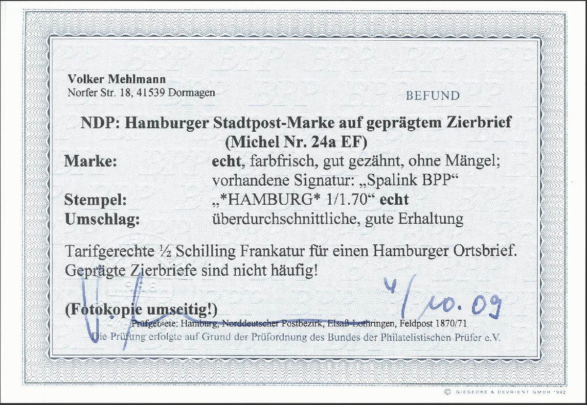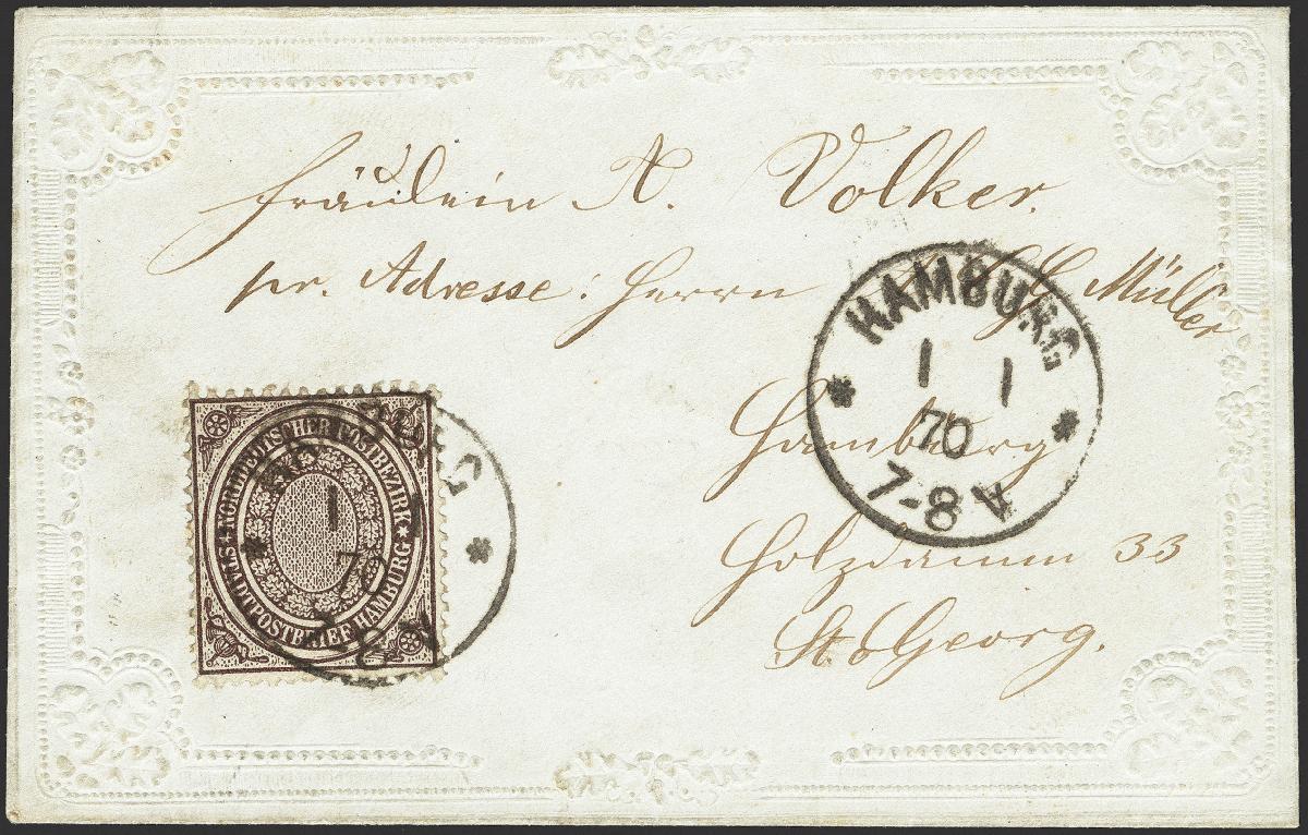 | Zusatzinformationen und Suchstichworte: | 376. Auktion Heinrich Köhler 19.-24. April 2021 Los 322 1869, ½ Schilling violettbraun, farbfrisch und gut gezähnt mit sauber auf- und nebengesetztem Einkreisstempel "HAMBURG 1 1 70" auf kleinem Briefkuvert mit dekorativer Zierborde nach St. Georg. Sehr schönes Stück. Fotobefund Mehlmann BPP Ausruf 300,00 EUR Zuschlag 1.100,00 EUR (aus der Sammlung Erivan Haub) |
