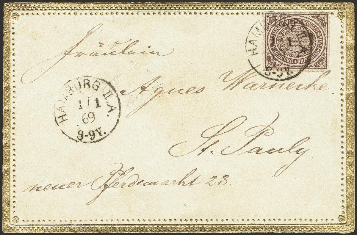 | Zusatzinformationen und Suchstichworte: | 376. Auktion Heinrich Köhler 19.-24. April 2021 Los 323 1868, Stadtpostmarke für Hamburg ½ Schilling lilabraun, farbfrisch und gut durchstochen mit sauber auf- und nebengesetztem Einkreisstempel "HAMBURG II.A. 1/1 69" auf Briefkuvert mit vorder- und rückseitig geprägter Zierborde mit aufgedruckter Vergoldung nach St. Pauli mit Ankunftsstempel vom gleichen Tag. Ein besonders attraktiver Neujahrs-Brief. Qualitäts-Prüfungsbefund Maria Brettl (1990). Laut Befund von Hern Mehlmann BPP kann nicht sicher nachgewiesen werden, ob der Goldrand zeitgerecht ist, wir versteigern daher "wie besehen" Ausruf 500,00 EUR Zuschlag 1.100,00 EUR (aus der Sammlung Erivan Haub) |