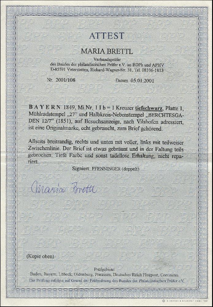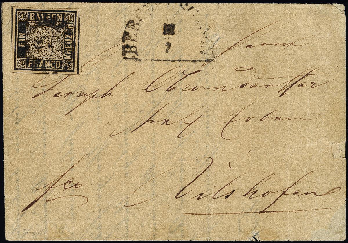 | Zusatzinformationen und Suchstichworte: | 376. Auktion Heinrich Köhler 19.-24. April 2021 Los 7008 1 Kreuzer tiefschwarz, Platte 1, allseits breitrandig, rechts und unten mit voller, links mit teilweiser Zwischenlinie, mit gMR "27" und nebengesetztem Halbkreisstempel "BERCHTESGADEN 12/7" (1851) auf fehlerhafter und in den Faltungen teils gebrochener Vertreteranzeige nach Vilshofen, insgesamt etwas getönt, signiert Pfenninger und Fotoattest Brettl BPP (2001) Zuschlag 3.000,00 EUR |