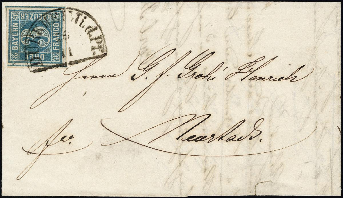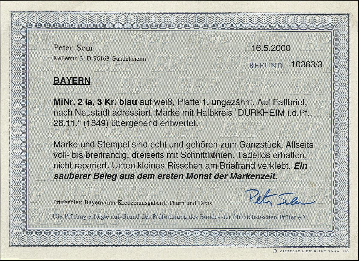 | Zusatzinformationen und Suchstichworte: | 376. Auktion Heinrich Köhler 19.-24. April 2021 Los 7013 3 Kreuzer blau, allseits breitrandig, dreiseitig mit kompletten Zwischenlinien, mit sauber aufgesetztem Halbkreisstempel "DÜRKHEIM i.d.Pf. 28/11" (1849) auf komplettem Faltbrief nach Neustadt; im Briefpapier unten kleiner Einriß verklebt, sonst tadellos. Fotobefund Sem BPP Zuschlag 240,00 EUR |