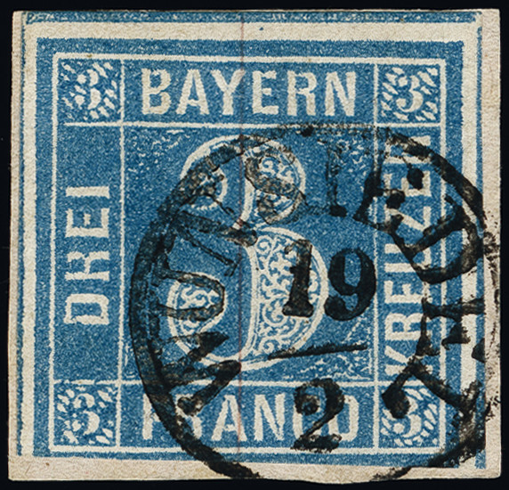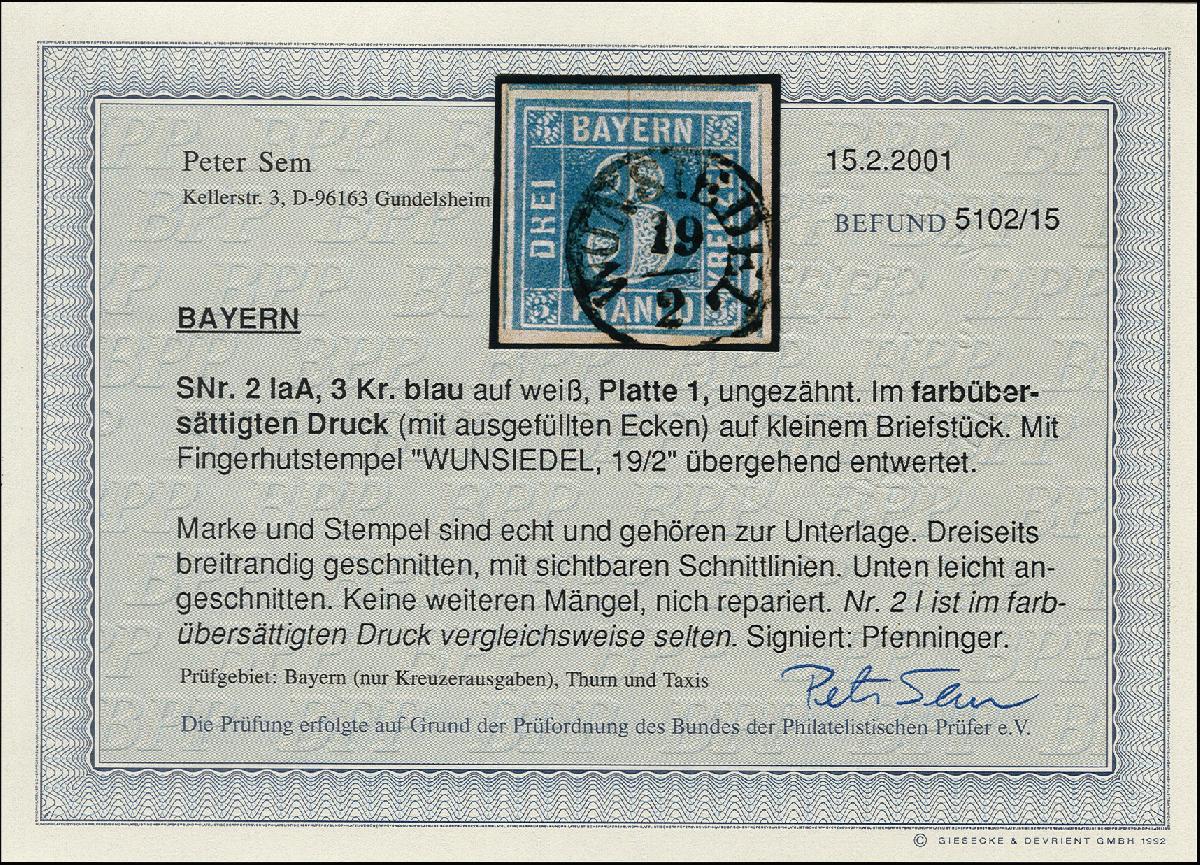 | Zusatzinformationen und Suchstichworte: | 376. Auktion Heinrich Köhler 19.-24. April 2021 Los 7017 3 Kreuzer blau mit ausgefüllten Ecken, unten in der Randlinie etwas berührt, sonst allseits breitrandig, mit sauber aufgesetztem Fingerhutstempel "WUNSIEDEL 19/2" auf kleinem Briefstück; signiert Pfenninger und Fotobefund Sem BPP Zuschlag 380,00 EUR |