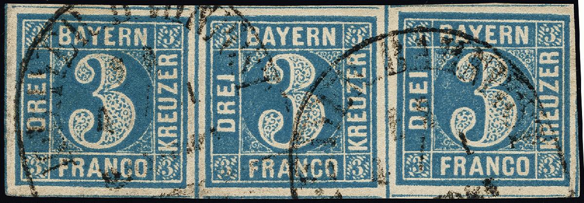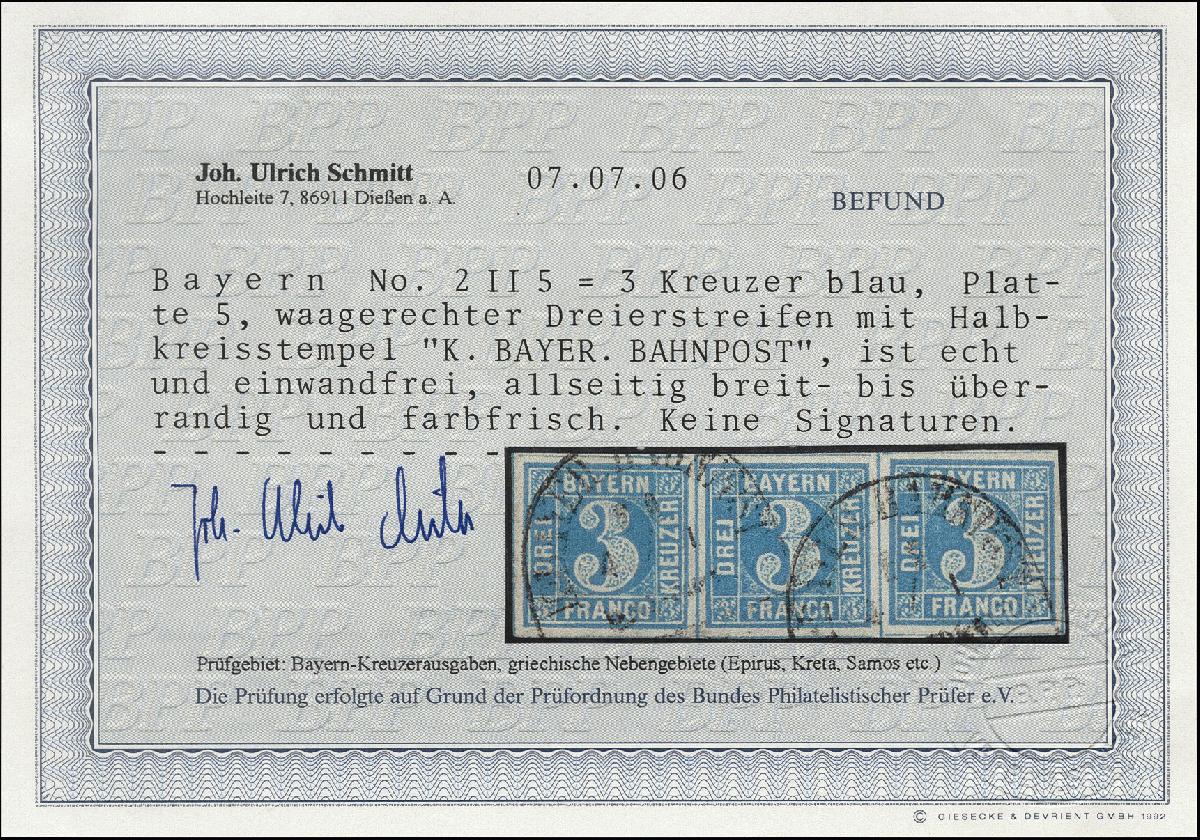 | Zusatzinformationen und Suchstichworte: | 376. Auktion Heinrich Köhler 19.-24. April 2021 Los 7031 3 Kreuzer blau, Platte 5, waagerechter 3er-Streifen, farbfrisch und allseits breitrandig mit fast vollständigen Zwischenlinien an allen Seiten, entwertet durch leicht aufgesetzten Halbkreisstempel der Bahnpost, Pracht, Fotobefund Schmitt BPP Zuschlag 240,00 EUR |