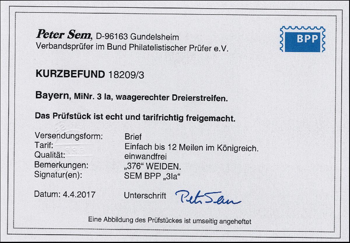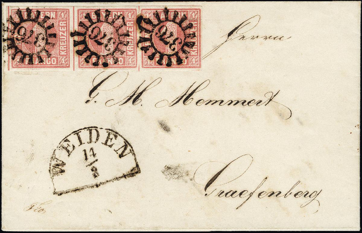 | Zusatzinformationen und Suchstichworte: | 376. Auktion Heinrich Köhler 19.-24. April 2021 Los 7035 1 Kreuzer rosa im waagerechten 3er-Streifen, farbfrisch und voll- bis meist breitrandig mit sauberem gMR "376" und nebengesetztem Halbkreis "WEIDEN 14/3" (1855) auf Briefhülle nach Gräfenberg, Pracht, signiert Sem BPP mit Kurzbefund Zuschlag 300,00 EUR |