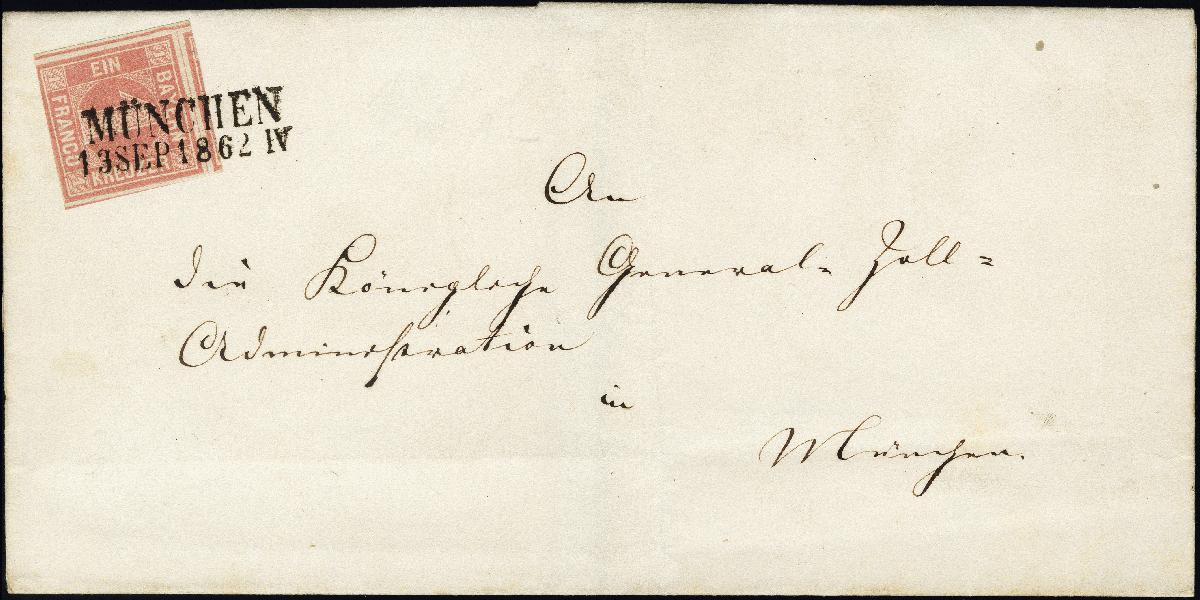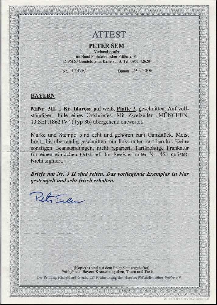 | Zusatzinformationen und Suchstichworte: | 376. Auktion Heinrich Köhler 19.-24. April 2021 Los 7039 1 Kreuzer rosa, Platte 2, sehr schön farbfrisch, dreiseitig breit- bis überrandig, oben mit Teil der Nachbarmarke, unten in der Randlinie teils leicht berührt, mit glasklar aufgesetztem L2 "MÜNCHEN 13 SEP 1862" auf Ortsbriefhülle. Ein attraktiver und außerordentlich seltener Brief; Fotoattest Sem BPP (2006) Zuschlag 2.100,00 EUR |