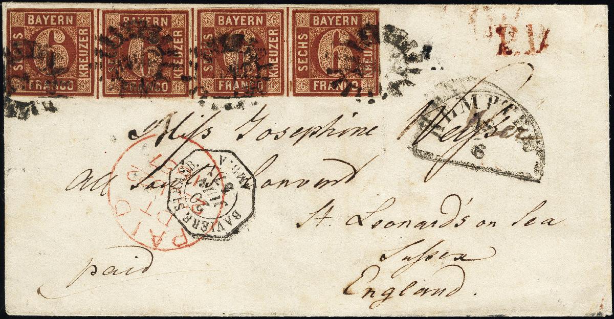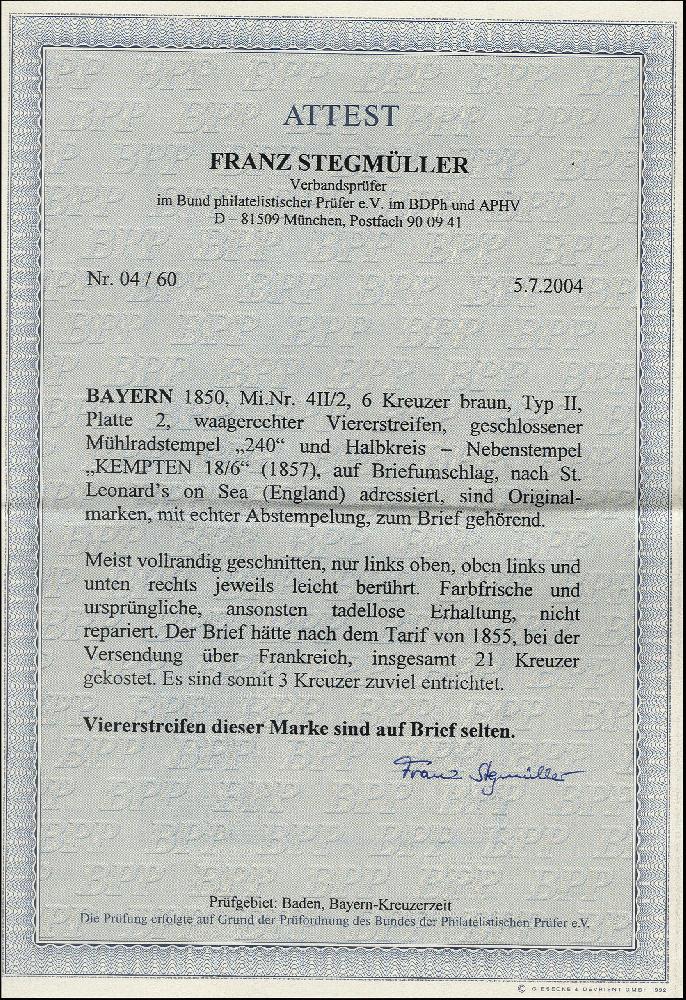 | Zusatzinformationen und Suchstichworte: | 376. Auktion Heinrich Köhler 19.-24. April 2021 Los 7041 6 Kreuzer braun im waagerechten 4er-Streifen, die linke Marke teils leicht berührt, sonst voll- bis breitrandig mit gMR "240" auf Briefkuvert mit nebengesetztem Halbkreis "KEMPTEN 18/6" (1857) über Frankreich nach England mit vorder- und rückseitigen Transit- und Ankunftsstempeln. Nach dem Tarif von 1855 ist der Brief um 3 Kreuzer überfrankiert; interessantes Stück, Fototattest Stegmüller BPP (2004) Zuschlag 750,00 EUR |