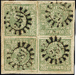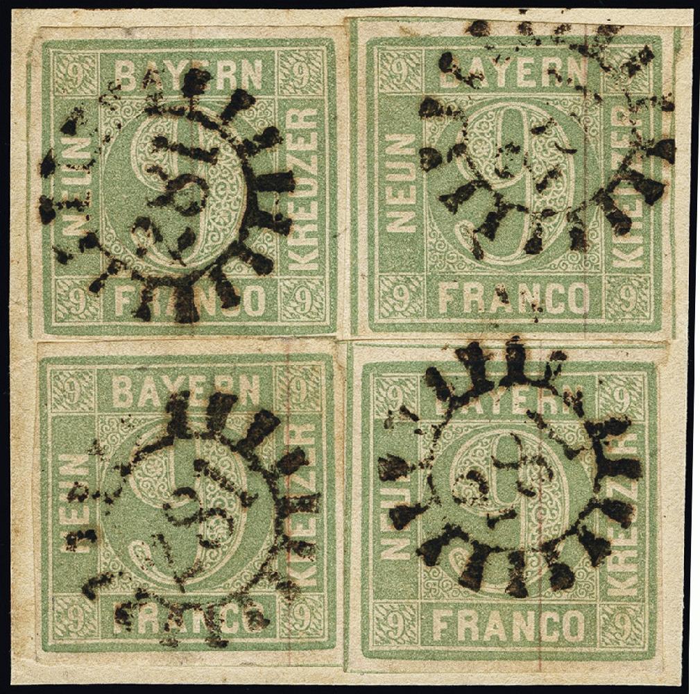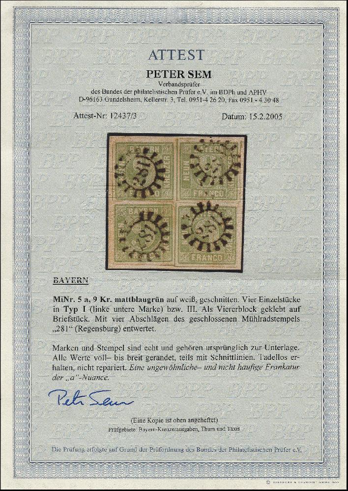 | Zusatzinformationen und Suchstichworte: | 376. Auktion Heinrich Köhler 19.-24. April 2021 Los 7044 9 Kreuzer bläulichgrün, 4 Einzelwerte als 4er-Block geklebt, dabei der linke untere Wert in Type I, sonst Type III, alle farbfrisch und voll- bis meist breitrandig mit gMR "281" REGENSBURG auf kleinem Briefstück, Pracht, Fotoattest Sem BPP (2005) Zuschlag 555,00 EUR |