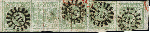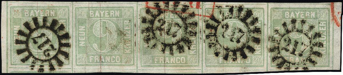 | Zusatzinformationen und Suchstichworte: | 376. Auktion Heinrich Köhler 19.-24. April 2021 Los 7045 9 Kreuzer bläulichgrün im waagerechten 5er-Streifen, die 4. Marke in Type II, sonst Type III, farbfrisch und allseits breit- bis überrandig mit schmalen Bogenrändern links und rechts sowie Teil einer Nachbarmarke; die 2. Marke im Streifen blieb versehentlich unentwertet, die übrigen entwertet durch gMR "217" MÜNCHEN, 3 Werte mit Teilen von roten Transitstempeln. Die unentwertet gebliebene Marke senkrechte Bugspur und kleine helle Stelle, die rechte Marke kleiner Knitter unten rechts, sonst einwandfrei. 5er-Streifen der frühen Auflagen sind sehr selten; Fotoattest Schmitt BPP (1999) Zuschlag 2.000,00 EUR |