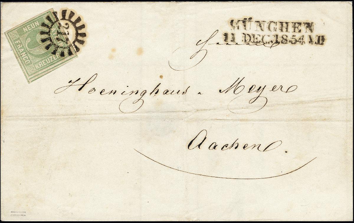 | Zusatzinformationen und Suchstichworte: | 376. Auktion Heinrich Köhler 19.-24. April 2021 Los 7052 9 Kreuzer blaugrün, farbfrisch und allseits breit- bis überrandig mit Zwischenlinien an 3 Seiten und kleinem Teil der rechten Nachbarmarke, übergehend entwertet durch gMR "217" auf Briefhülle mit nebengesetztem L2 "MÜNCHEN 11 DEC. 1854" nach Aachen. Die Hülle mit Aktenfaltungen außerhalb der Frankatur und gering fleckig, sonst einwandfrei, signiert Pfenninger und Fotoattest Sem BPP (2000) Zuschlag 120,00 EUR |