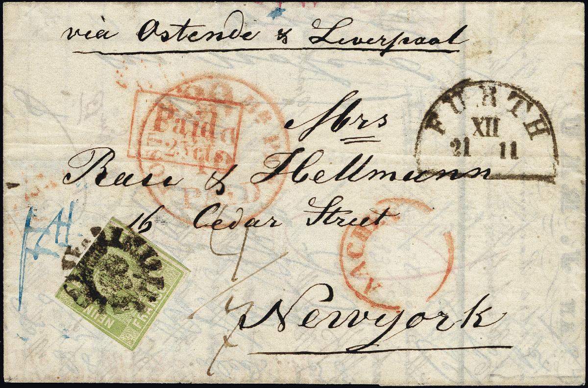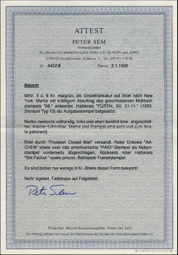 | Zusatzinformationen und Suchstichworte: | 376. Auktion Heinrich Köhler 19.-24. April 2021 Los 7053 9 Kreuzer maigrün, zweiseitig voll- bis breitrandig, sonst etwas berührt bzw. angeschnitten, mit gMR "98" und nebengesetztem Halbkreis "FÜRTH 21 11" (1853) auf komplettem Faltbrief über die 'Prussian Closed Mail' nach New York. Der Brief war mit 47 Kreuzern bis zum Bestimmungsort bezahlt, jedoch nur die Postvereinsgebühr frankiert, das Weiterfranko vorderseitig mit "4/7" (Silbergroschen für das Porto bis Großbritannien und das Seeporto) notiert, rückseitig mit "24 /14" (Kreuzer). Ein attraktiver und seltener Transatlantikbrief mit 'geteiltem Franko'. Fotoattest Sem BPP (1995) Ausruf 1.000,00 EUR |