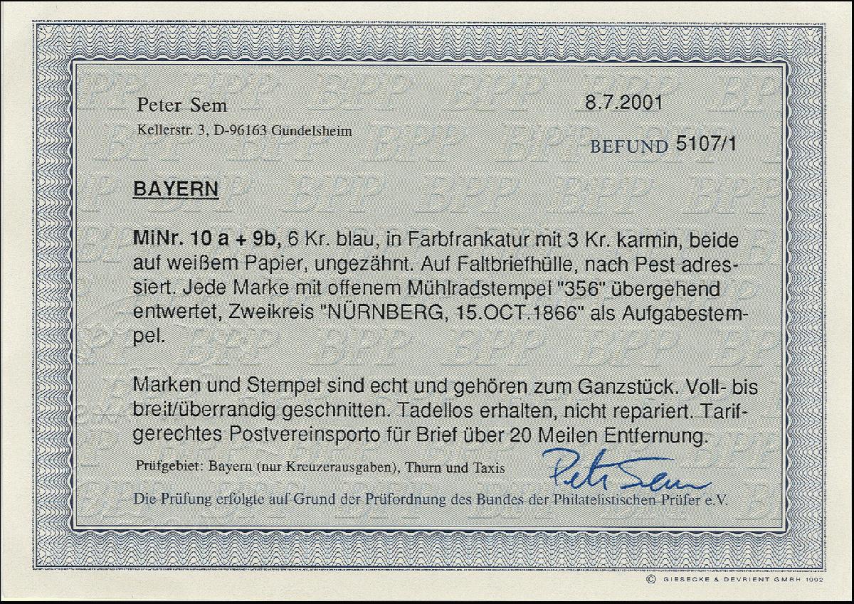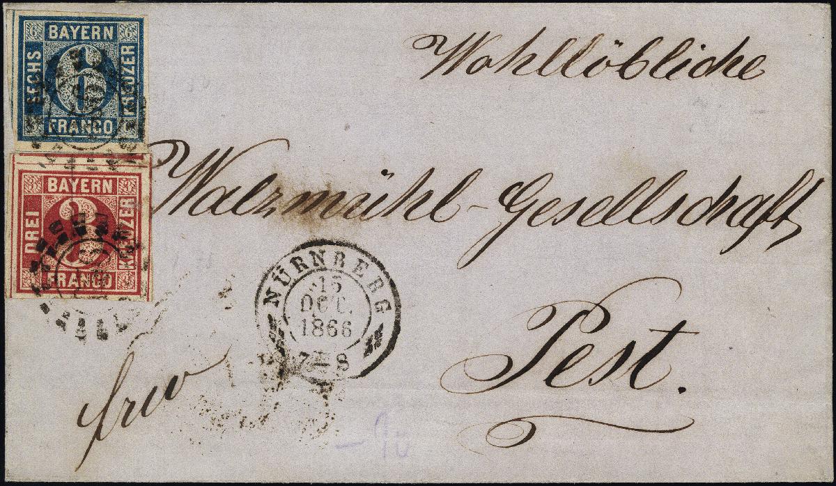 | Zusatzinformationen und Suchstichworte: | 376. Auktion Heinrich Köhler 19.-24. April 2021 Los 7075 3 Kreuzer karmin und 6 Kreuzer blau, beide voll- bis breitrandig, die 3 Kreuzer oben mit Teil der Nachbarmarke, mit oMR "356" und nebengesetztem DKr. "NÜRNBERG 15 OCT. 1866" auf Briefhülle nach Pest im Wechselverkehr mit Ungarn, Fotobefund Sem BPP Zuschlag 120,00 EUR |