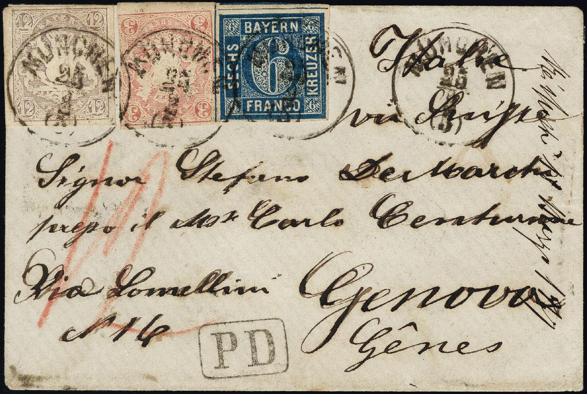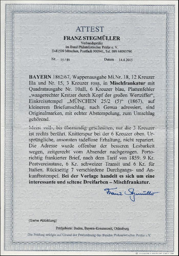 | Zusatzinformationen und Suchstichworte: | 376. Auktion Heinrich Köhler 19.-24. April 2021 Los 7080 6 Kreuzer blau in Mischfrankatur mit 1867, Wappen 3 Kreuzer rosa und 12 Kreuzer lila, die 3 Kreuzer rechts berührt, sonst alle voll- bis breitrandig, die 6 Kreuzer mit kleiner Knitterspur oben, sonst einwandfrei, mit EKr. "MÜNCHEN 25/2" (1867) auf kleinem Briefkuvert über die Schweiz nach Genua. Der Brief ist nach dem Tarif von 1859 portogerecht frankiert mit 9 Kreuzern Vereinstaxe, 6 Kreuzern Schweizer Transit und 6 Kreuzern italienischem Porto, die Anschrift offenbar schon vom Absender zur Hervorhebung komplett nachgezogen. Eine attraktive und seltene Mischfrankatur. Fotoattest Stegmüller BPP (2015) Zuschlag 1.050,00 EUR |