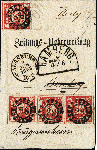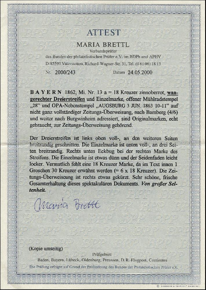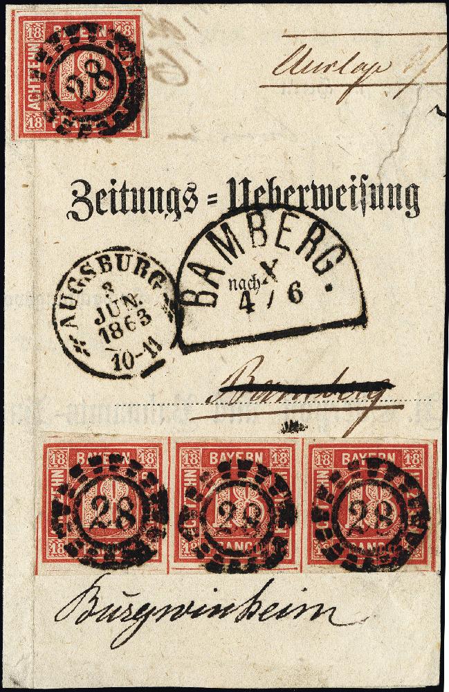 | Zusatzinformationen und Suchstichworte: | 376. Auktion Heinrich Köhler 19.-24. April 2021 Los 7086 18 Kreuzer zinnoberrot, waagerechter 3er-Streifen und Einzelmarke, alle farbfrisch und voll- bis meist breitrandig mit sauberem oMR "28" und nebengesetztem DKr. "AUGSBURG" auf großem Teil einer Zeitungs-Überweisung nach Bamberg, nachgesandt nach Burgwinheim; das Formular rechts verkürzt, eine weitere 18 Kreuzer-Marke fehlt vermutlich, da inseitig eine Gesamtgebühr von 1 Gulden 30 Kreuzern vermerkt ist. Die Einzelmarke ist etwas dünn und der Seidenfaden leicht locker, der 3er-Streifen bis auf einen leichten Eckbug unten rechts einwandfrei. Ein sehr attraktives Stück, Fotoattest Brettl BPP (2000) Zuschlag 2.600,00 EUR |