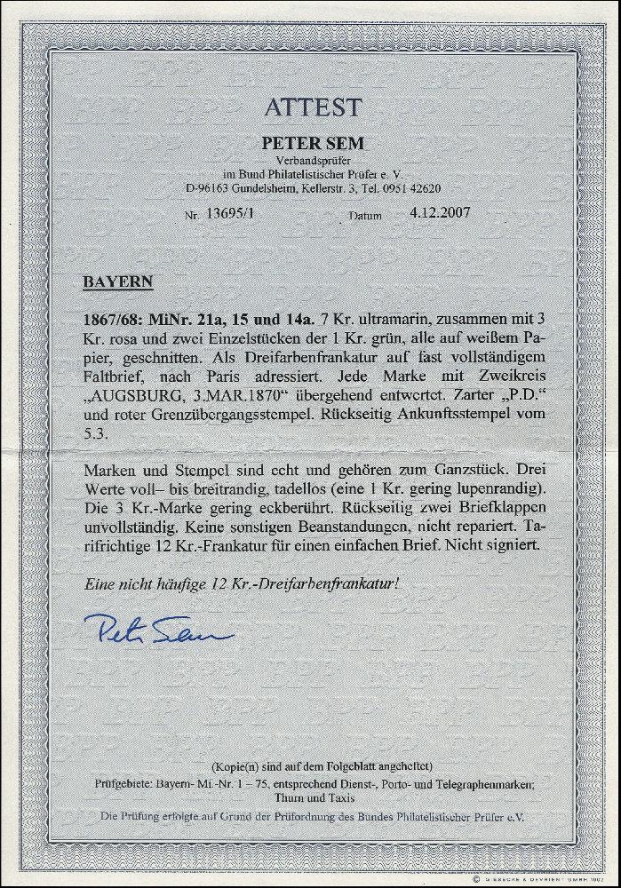 | Zusatzinformationen und Suchstichworte: | 376. Auktion Heinrich Köhler 19.-24. April 2021 Los 7094 1 Kreuzer grün, 2 Einzelstücke, zusammen mit 3 Kreuzer rosa und 7 Kreuzer ultramarin, eine 1 Kreuzer und 3 Kreuzer je gering berührt, sonst voll- bis breitrandig und farbfrisch mit DKr. "AUGSBURG 3 MAR. 1870" auf nicht ganz kompletten Faltbrief nach Paris; eine attraktive Dreifarben-Frankatur, Fotoattest Sem BPP (2007) Zuschlag 400,00 EUR |