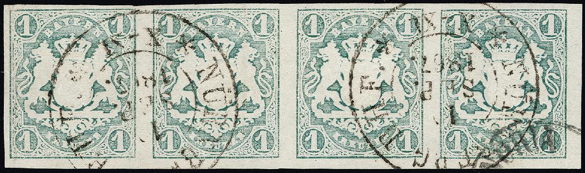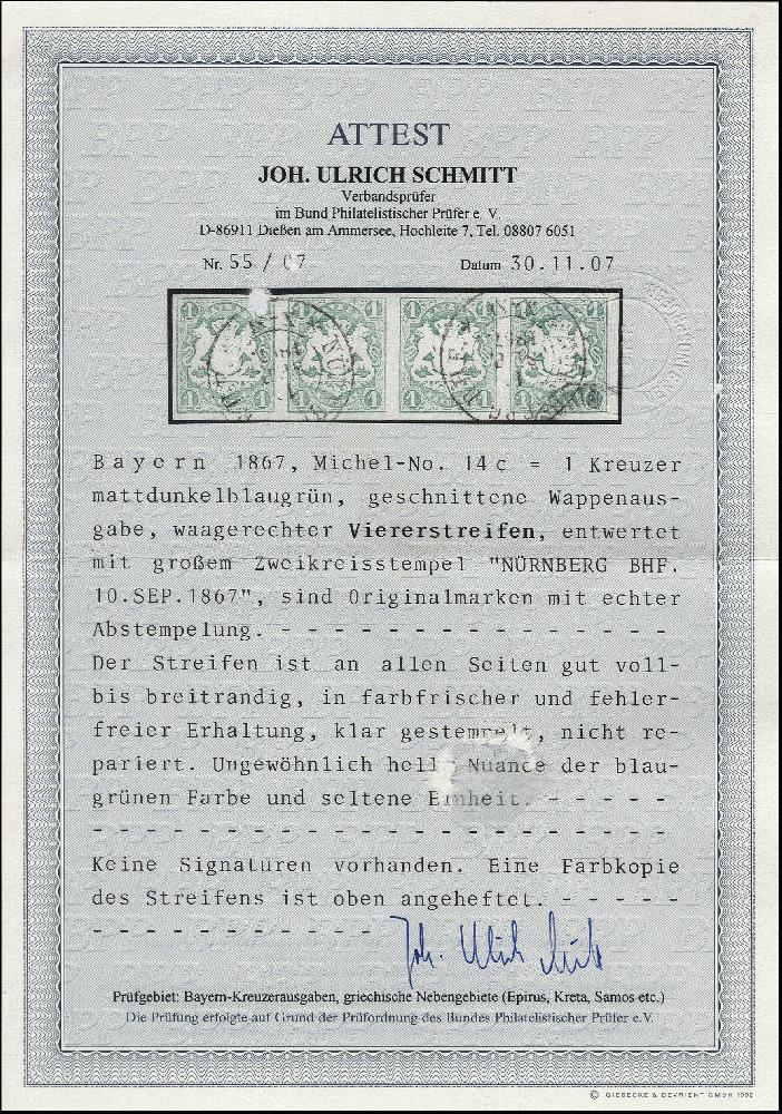 | Zusatzinformationen und Suchstichworte: | 376. Auktion Heinrich Köhler 19.-24. April 2021 Los 7096 1 Kreuzer dunkelblaugrün im waagerechten 4er-Streifen, farbfrisch in heller Nuance, gut voll- bis meist breitrandig, sauber entwertet durch großen DKr. "NÜRNBERG BHF. 10. SEP. 1867", Pracht, Fotoattest Schmitt BPP (dieses etwas fehlerhaft, 2007) Zuschlag 580,00 EUR |