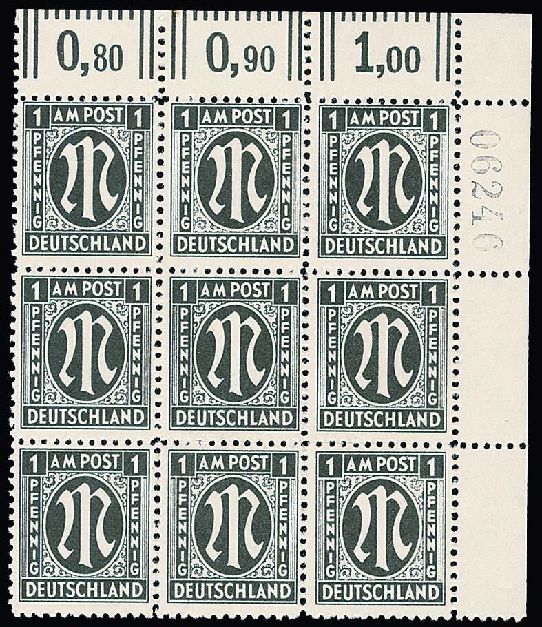 | Zusatzinformationen und Suchstichworte: | Rauhut & Kruschel - 218. Auktion 10. Juni 2023 Los 3197 Bizone 1 Pfg. AM-Post, gute Zähnung L 11 1/2, im postfrischen 12er-Block aus der rechten oberen Bogenecke mit schwarzer, fünfstelliger Bogenzählnummer Ausruf 250,00 EUR |