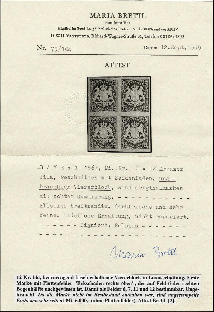 | Zusatzinformationen und Suchstichworte: | 376. Auktion Heinrich Köhler 19.-24. April 2021 Los 7101 12 Kreuzer lila im 4er-Block, dabei die linke obere Marke mit Plattenfehler "rechte obere Ecke abgeschrägt", farbfrisch und allseits breitrandig, ungebraucht mit frischem Originalgummi; ein schöner und seltener Block. Signier Fulpius und Fotoattest Brettl BPP (1979) Zuschlag 3.200,00 EUR |