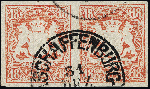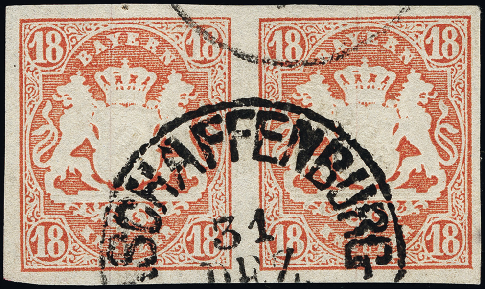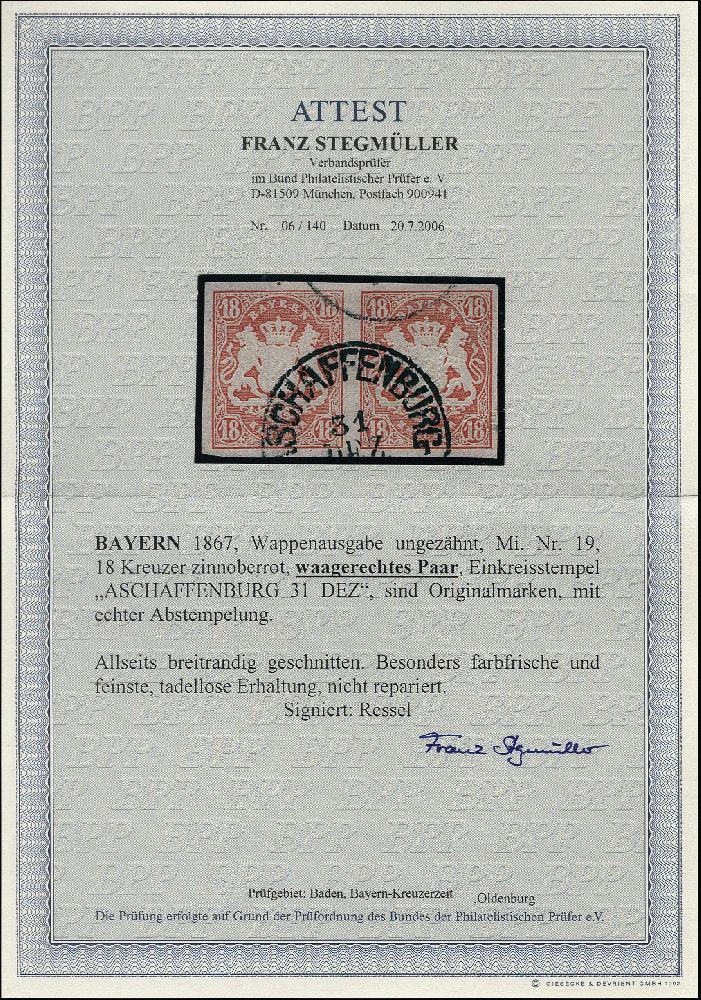 | Zusatzinformationen und Suchstichworte: | 376. Auktion Heinrich Köhler 19.-24. April 2021 Los 7104 18 Kreuzer zinnoberrot im waagerechten Paar, sehr schön farbfrisch und allseits breitrandig, sauber entwertet durch EKr. "ASCHAFFENBURG 31 DEZ.", Kabinett, signiert Ressel und Fotoattest Stegmüller BPP (2006) Zuschlag 480,00 EUR |