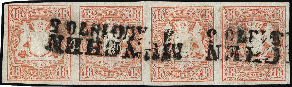 | Zusatzinformationen und Suchstichworte: | 376. Auktion Heinrich Köhler 19.-24. April 2021 Los 7105 18 Kreuzer ziegelrot im waagerechten 4er-Streifen, farbfrisch und voll- bis breitrandig, entwertet durch L2 "MÜNCHEN 3. AUG. 1870". Der Streifen ist zwischen den Marken vorgefaltet, dabei die linke Marke im rechten Rand getroffen, sonst einwandfrei. Eine seltene Streifeneinheit, wir haben keinen weiteren 4er-Streifen mit Poststempel registriert. Fotoattest Sem BPP (2006) Zuschlag 1.200,00 EUR |