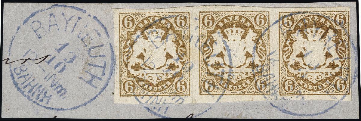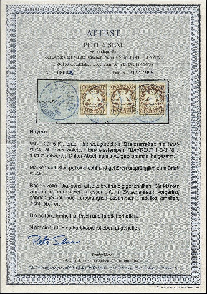 | Zusatzinformationen und Suchstichworte: | 376. Auktion Heinrich Köhler 19.-24. April 2021 Los 7107 6 Kreuzer braun im waagerechten 3er-Streifen, voll- bis meist breitrandig und farbfrisch mit violettem EKr. "BAYREUTH BAHNH. 19/10" auf Briefstück. Die Marken in den Zwischenräumen mit Federmesser vorgeritzt, jedoch noch ursprünglich zusammenhängend, sonst einwandfrei. Fotoattest Sem BPP (1996) Zuschlag 1.000,00 EUR |
