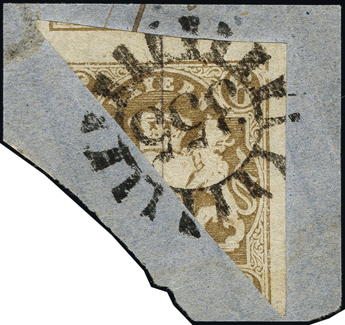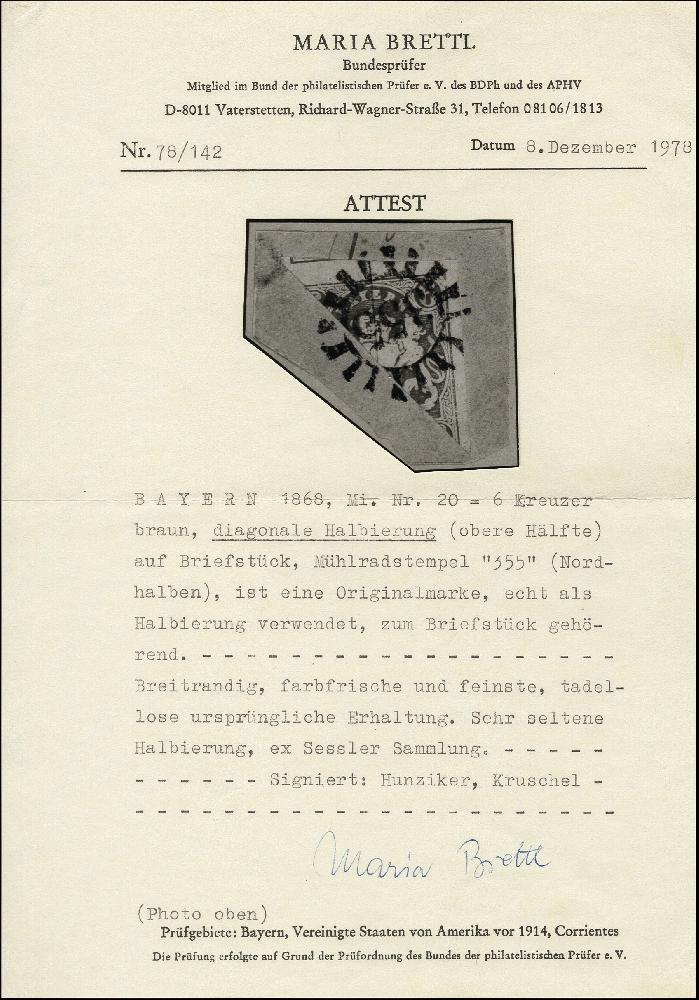 | Zusatzinformationen und Suchstichworte: | 376. Auktion Heinrich Köhler 19.-24. April 2021 Los 7109 6 Kreuzer ockerbraun diagonal halbiert, breit- bis überrandig und farbfrisch mit klar aufgesetztem gMR "355" NORDHALBEN auf kleinem Briefstück, tadellose und ursprüngliche Erhaltung. Von dieser Halbierung haben wir insgesamt nur 3 weitere Stücke registriert und zwar auf Briefen von Eggenfelden bzw. Münchweiler; dies ist das einzige registrierte Stück mit Nummernstempelentwertung. Eine große Seltenheit der Bayern-Philatelie. Signiert Hunziker und Kruschel, Fotoattest Brettl BPP (1978) und Fotoattest Stegmüller BPP (2018) Zuschlag 3.200,00 EUR |