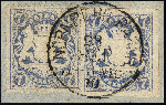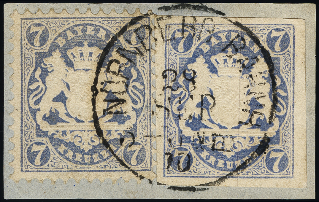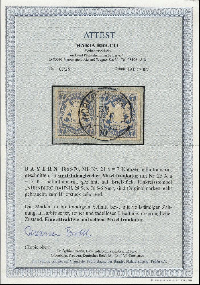 | Zusatzinformationen und Suchstichworte: | 376. Auktion Heinrich Köhler 19.-24. April 2021 Los 7111 7 Kreuzer hellultramarin, allseits breitrandig, in wertstufengleicher Mischfrankatur mit gezähnter Ausgabe 7 Kreuzer mit Wasserzeichen "enge Rauten", mit sauber aufgesetztem EKr. "NÜRNBERG BAHNH. 28 SEP. 70" auf Briefstück. Eine attraktive und außerordentlich seltene Kombination die nur noch auf wenigen Briefstücken jedoch nicht auf Ganzstück bekannt geworden ist. Fotoattest Brettl BPP (2007) Zuschlag 500,00 EUR |