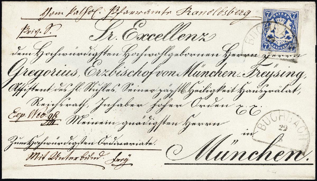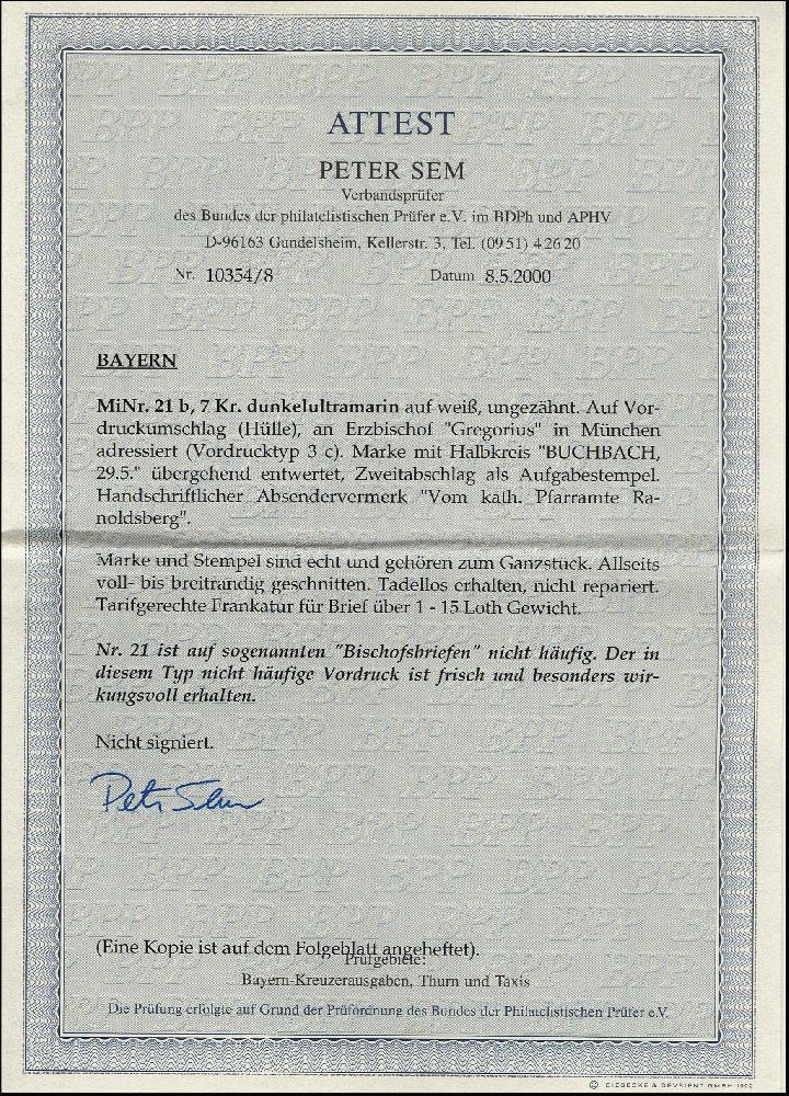 | Zusatzinformationen und Suchstichworte: | 376. Auktion Heinrich Köhler 19.-24. April 2021 Los 7113 7 Kreuzer dunkelultramarin, farbfrisch und voll- bis breitrandig (rechts Vortrennschnitt außerhalb des Markenbildes) mit sauber auf- und nebengesetztem Halbkreisstempel "BUCHBACH 22/5" auf Bischofsbrief-Hülle (rückseitiges Siegel ausgeschnitten) mit handschriftlichem Vermerk "Mit Unterbund" an Gregor in München. Ein sehr attraktiver Brief in einwandfreier Erhaltung, Fotoattest Sem BPP (2000) Zuschlag 520,00 EUR |