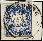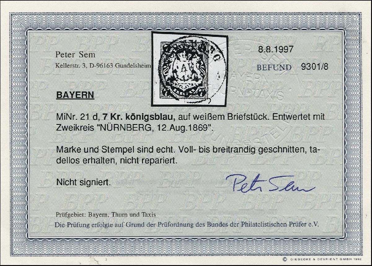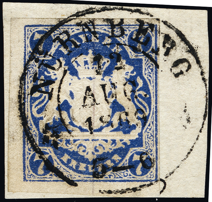 | Zusatzinformationen und Suchstichworte: | 376. Auktion Heinrich Köhler 19.-24. April 2021 Los 7116 7 Kreuzer königsblau, voll- bis breitrandig mit DKr. "NÜRNBERG 12 AUG. 1869" auf Briefstück, Pracht, Fotobefund Sem BPP (1997) Zuschlag 180,00 EUR |