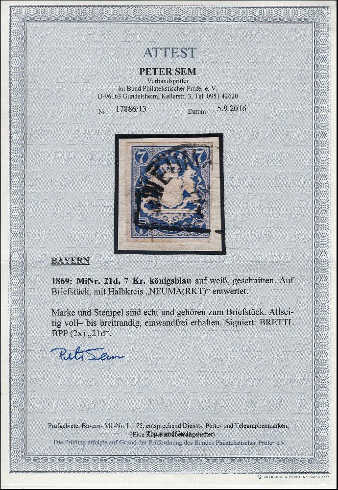 | Zusatzinformationen und Suchstichworte: | 376. Auktion Heinrich Köhler 19.-24. April 2021 Los 7117 7 Kreuzer königsblau, sehr schön farbfrisch und voll- bis meist breitrandig mit Halbkreis "NEUMARKT" auf kleinem Briefstück, Pracht, signiert Brettl BPP und Fotoattest Sem BPP (2016) Zuschlag 220,00 EUR |