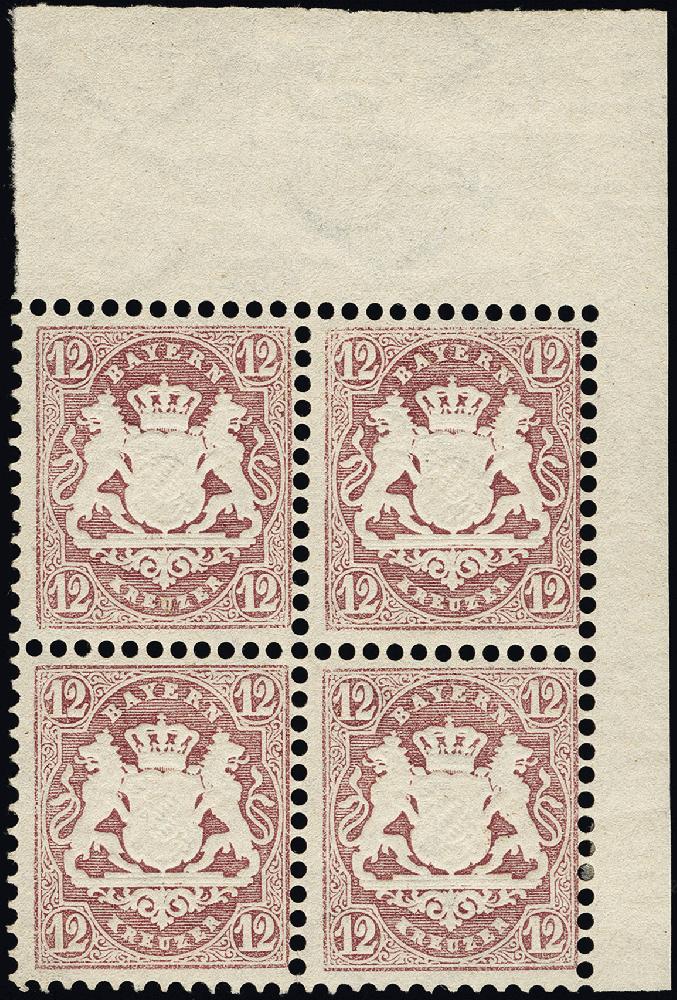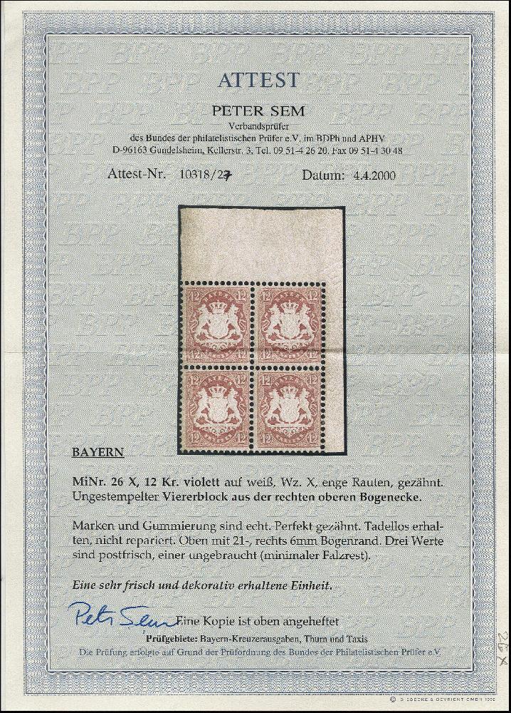 | Zusatzinformationen und Suchstichworte: | 376. Auktion Heinrich Köhler 19.-24. April 2021 Los 7123 12 Kreuzer lila im 4er-Block aus der rechten oberen Bogenecke mit ca. 6/21 mm Bogenrändern, farbfrisch und einwandfrei gezähnt; in den Bogenrändern Falzreste, einmal die rechte untere Marke leicht tangierend, die übrigen 3 Werte postfrisch. Eine attraktive und seltene Einheit, unsigniert, Fotoattest Sem BPP (2000) Zuschlag 1.000,00 EUR |