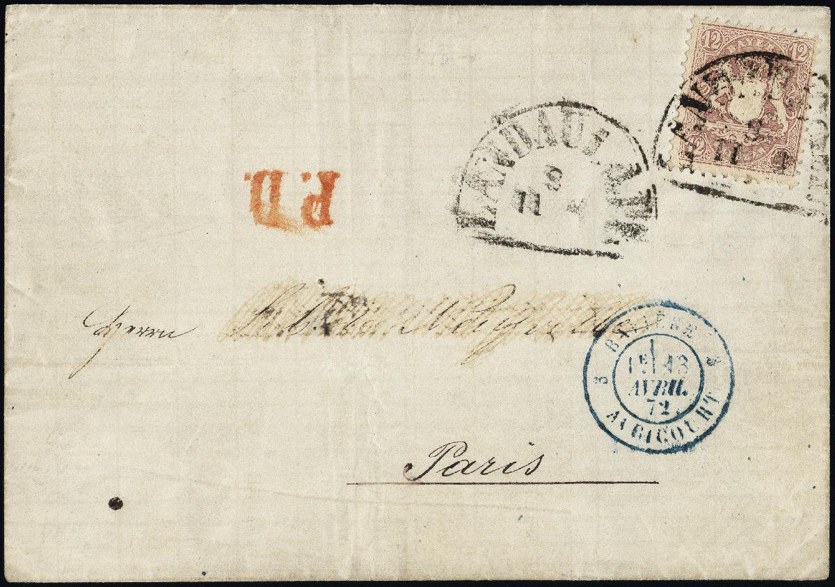 | Zusatzinformationen und Suchstichworte: | 376. Auktion Heinrich Köhler 19.-24. April 2021 Los 7126 12 Kreuzer lila, farbfrisch und gut gezähnt mit Halbkreis "LANDAU i.d.Pf. 11 4 " (1872) auf Briefhülle nach Paris, der Name in der Anschrift unkenntlich gemacht und radiert, sonst einwandfrei. Signiert Larisch und Thier, Fotoattest Stegmüller BPP (2018) Zuschlag 1.350,00 EUR |