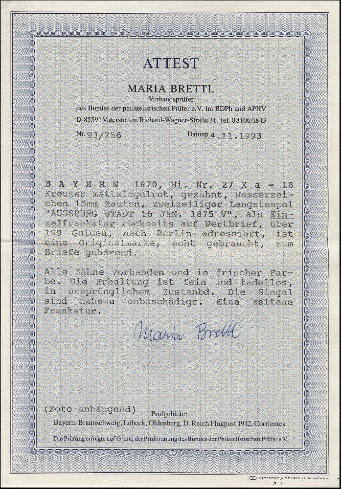 | Zusatzinformationen und Suchstichworte: | 376. Auktion Heinrich Köhler 19.-24. April 2021 Los 7131 18 Kreuzer mattziegelrot, farbfrisch und gut gezähnt mit leicht aufgesetztem L2 "AUGSBURG STADT 16 JAN. 1875" rückseitig auf Wertbrief über 199 Gulden nach Berlin. Eine schöne und seltene Einzelfrankatur, Fotoattest Brettl BPP (1993) Zuschlag 650,00 EUR |