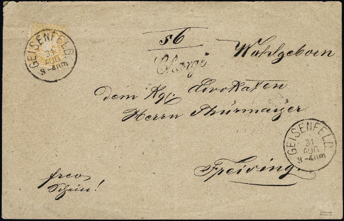 | Zusatzinformationen und Suchstichworte: | 376. Auktion Heinrich Köhler 19.-24. April 2021 Los 7141 10 Kreuzer mattgelb, farbfrisch und gut gezähnt mit sauber auf und nebengesetztem EKr. "GEISENFELD 31 AUG." auf etwas größerformatiger Chargé-Briefhülle nach Freising. Eine in dieser Form seltene Einzelfrankatur in einwandfreier Erhaltung. Signiert Pfenninger und Fotoattest Brettl BPP (2000) Zuschlag 500,00 EUR |