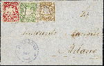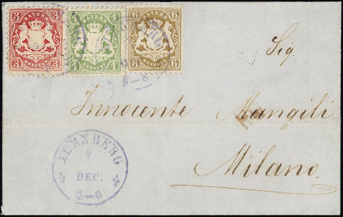 | Zusatzinformationen und Suchstichworte: | 376. Auktion Heinrich Köhler 19.-24. April 2021 Los 7143 1 Kreuzer gelbgrün, 3 Kreuzer rosa und 6 Kreuzer ockerbraun, letztere links oben ein Zahn ausgerissen, sonst alle gut gezähnt und farbfrisch mit violettem EKr. "NÜRNBERG 2 DEC." auf Briefhülle nach Mailand, in den Faltungen teils gering getrennt, Fotobefund Sem BPP Zuschlag 280,00 EUR |