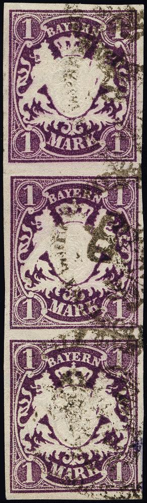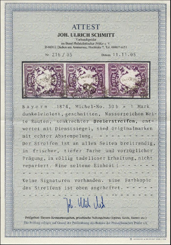 | Zusatzinformationen und Suchstichworte: | 376. Auktion Heinrich Köhler 19.-24. April 2021 Los 7154 1 Mark dunkelviolett geschnitten im senkrechten 3er-Streifen, farbfrisch und voll- bis meist breitrandig, entwertet durch Dienstsiegel, Pracht, Fotoattest Schmitt BPP (2005) Zuschlag 150,00 EUR |