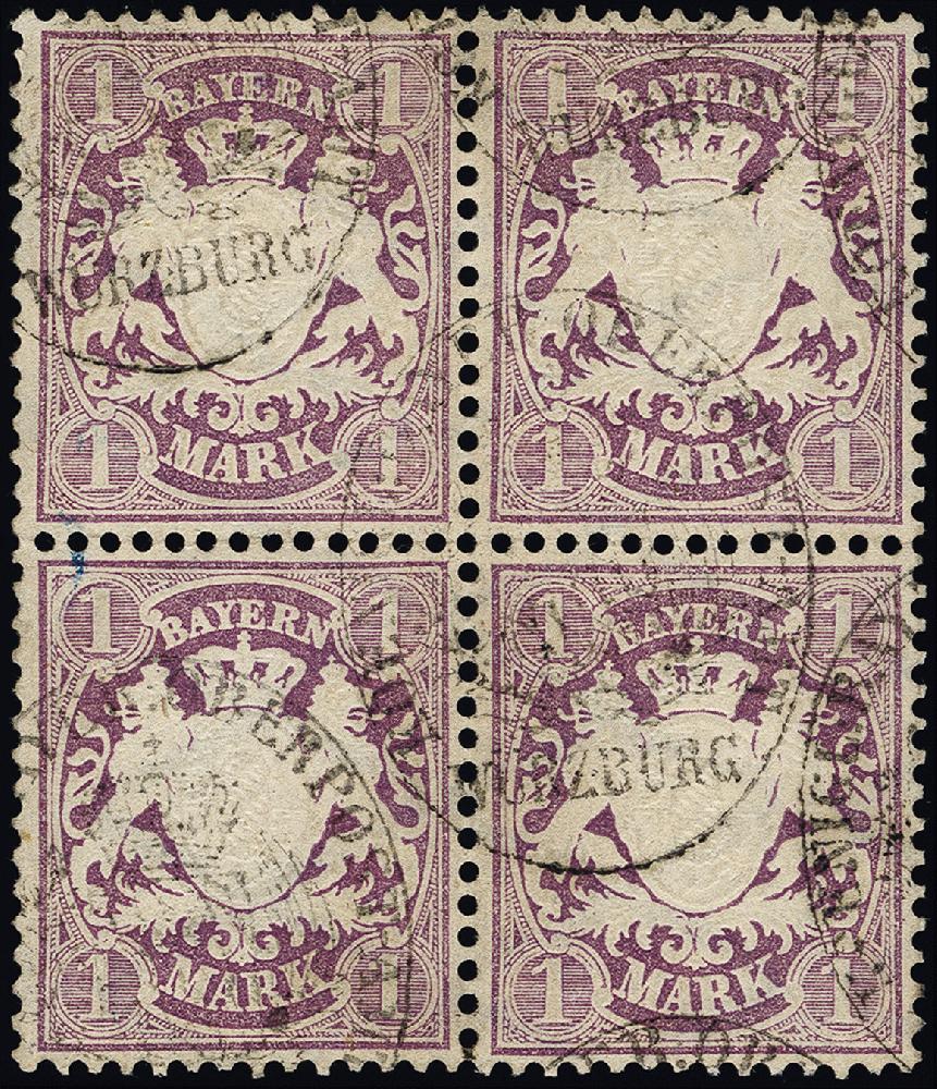 | Zusatzinformationen und Suchstichworte: | 376. Auktion Heinrich Köhler 19.-24. April 2021 Los 7157 1 Mark gezähnt, violett, 4er-Block, farbfrisch und gut gezähnt, leicht entwertet durch ovalen Siegelstempel des Oberpostamtes von Würzburg, Pracht, Fotoattest Stegmüller BPP (2017) Zuschlag 240,00 EUR |