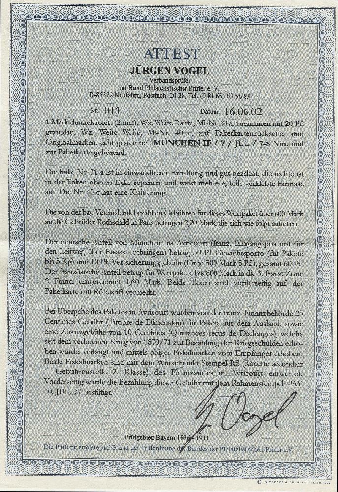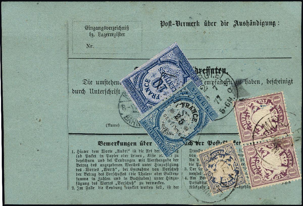 | Zusatzinformationen und Suchstichworte: | 376. Auktion Heinrich Köhler 19.-24. April 2021 Los 7158 1 Mark gezähnt, violett, waagerechtes Paar, die rechte Marke unauffällig fehlerhaft bzw. kleine Reparatur, die linke einwandfrei, zusammen mit 20 Pfennig ultramarin (kleine Aufklebeknitter) mit EKr. "MÜNCHEN 7 JUL." (1877) rückseitig auf kompletter Wert-Paketkarte an die Gebrüder Rotfeld in Paris, in Frankreich zusätzlich frankiert mit 2 Fiskalmarken. Ein seltenes und attraktives Stück, Fotoattest Vogel BPP (2002) Zuschlag 700,00 EUR |