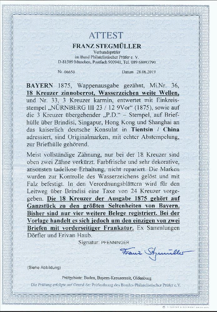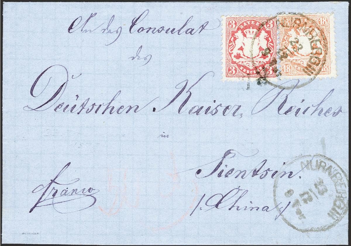 | Zusatzinformationen und Suchstichworte: | 376. Auktion Heinrich Köhler 19.-24. April 2021 Los 7164 1875, Wappenausgabe mit Wasserzeichen 'weite Wellen' 18 Kreuzer zinnoberrot und 3 Kreuzer karmin, beide farbfrisch, die 18 Kreuzer oben zwei verkürzte Zähne, sonst beide einwandfrei, mit sauber auf- und nebengesetztem EKr. "NÜRNBERG III 23/12" (1875) auf Briefhülle adressiert an das "Consulat des Deutschen Kaiser Reiches Tientsin". Der Brief wurde befördert über Brindisi, Singapur, Hongkong (rückseitig "MARINE SORTER SINGAPORE TO HONG KONG" ) bis Shanghai. Hier der kaiserlich chinesischen Post übergeben und mit rückseitigem roten "CUSTOMS SHANGHAI FEB 9 76" weiterbefördert nach Tientsin. Obwohl in den Verordnungsblättern für den Leitweg über Brindisi eine Taxe von 24 Kreuzern vorgegeben ist, wurde der Brief unbeanstandet befördert. Zu dieser Zeit konnten Briefe nach China aufgrund fehlender Postverträge nur bis zu den Hafenstädten mit europäischen Postverwaltungen, also in der Regel Hongkong und Shanghai, befördert werden, die weitere Beförderung der wenigen Post ins Landesinnere übernahmen in der Regel private Agenten oder in seltenen Fällen die chinesische 'Customs'-Post, welche erst 1878 eigene Briefmarken einführte. Die 18 Kreuzer 'weite Wellen' war nur vom 5. Juli bis 31. Dezember 1875 frankaturgültig; sie zählt auf Ganzstück zu den größten Seltenheiten der Bayern-Philatelie. Neben dem hier angebotenen Brief nach China sind nur ein weiterer Brief (jedoch mit rückseitiger Frankatur der Marke) sowie 2 Paketkarten bekannt. Die Marken waren zur Kontrolle des Wasserzeichens gelöst und sind mit Falzen replatziert. Ein altbekannter und spektakulärer Auslandsbrief. Signiert Pfenninger mit Befund (1961), Fotoattest Stegmüller BPP (2019) Zuschlag 34.000,00 EUR |
