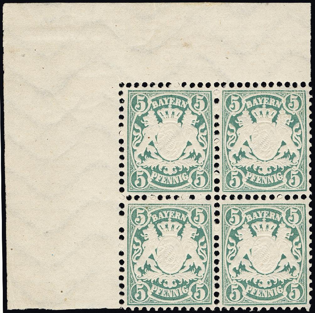 | Zusatzinformationen und Suchstichworte: | 376. Auktion Heinrich Köhler 19.-24. April 2021 Los 7165 5 Pfennig opalgrün im 4er-Block aus der linken oberen Bogenecke, farbfrisch und gut gezähnt, die Marken postfrisch, Falzspuren lediglich im Bogenrand, in der linken Zähnung leicht gefaltet, sonst einwandfrei. Eine seltene Einheit, unsigniert, Fotoattest Dr. Helbig BPP (2000) Zuschlag 320,00 EUR |