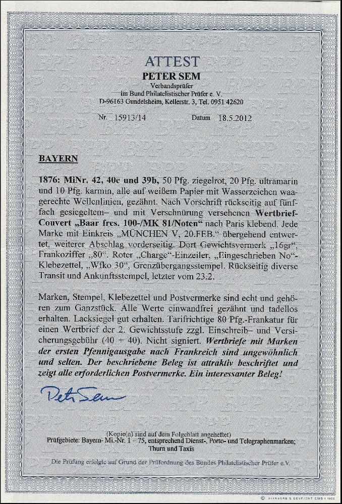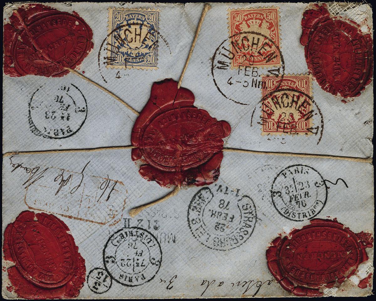 | Zusatzinformationen und Suchstichworte: | 376. Auktion Heinrich Köhler 19.-24. April 2021 Los 7169 50 Pfennig zinnoberrot mit 20 Pfennig ultramarin und 10 Pfennig karmin, mit EKr. "MÜNCHEN 20 FEB." (1878) rückseitig auf gesiegeltem und mit Kordel verbundenem Wertbrief mit 81 Mark nach Paris, Frankatur und Brief in guter Bedarfserhaltung; ein attraktives und seltenes Stück, Fotoattest Sem BPP (2012) Ausruf 500,00 EUR |