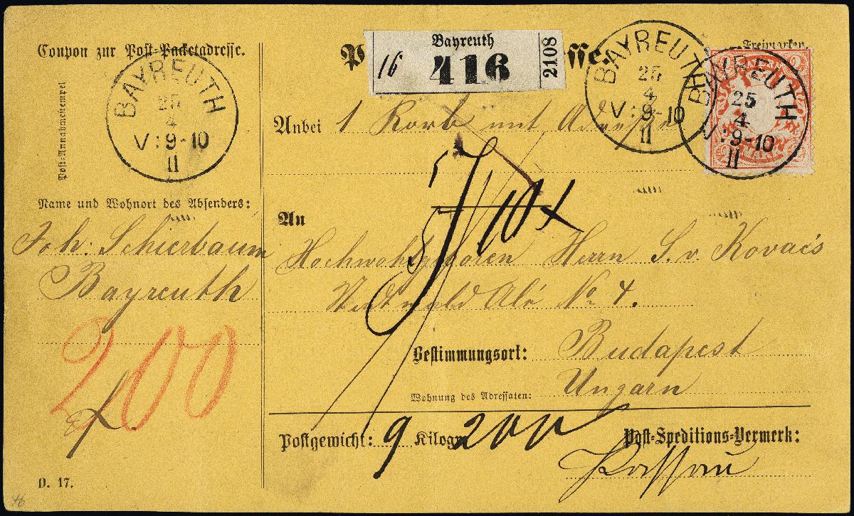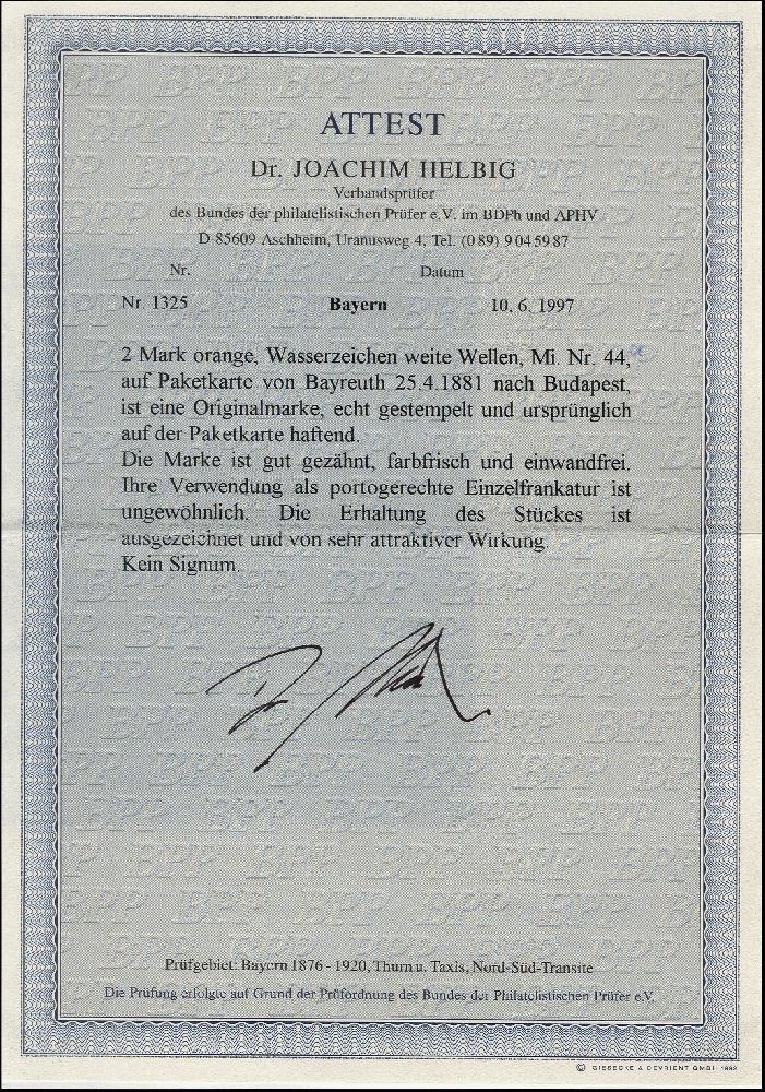| Zusatzinformationen und Suchstichworte: | 376. Auktion Heinrich Köhler 19.-24. April 2021 Los 7171 2 Mark orange, farbfrisch und gut gezähnt mit sauberem EKr. "BAYREUTH 25 4" (1881) als Einzelfrankatur auf kompletter Paketkarte nach Budapest mit rückseitigem Eingangsstempel; eine attraktive und nicht häufige Einzelfrankatur, Fotoattest Helbig BPP (1997) Zuschlag 320,00 EUR |