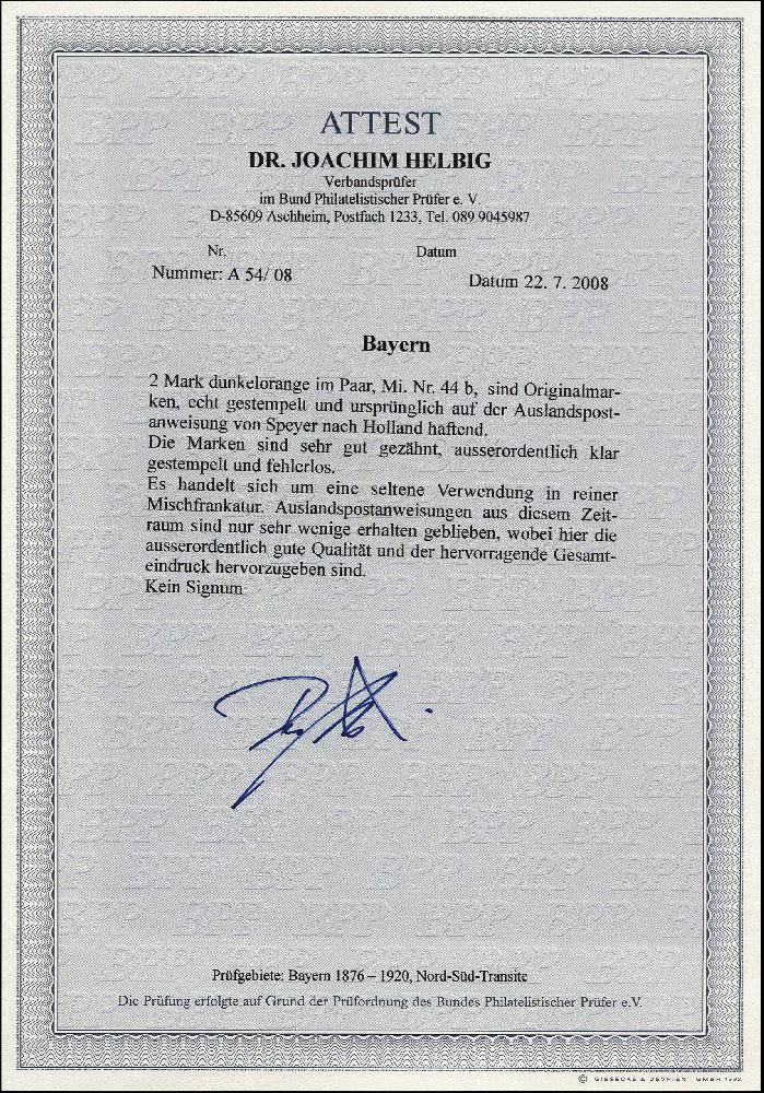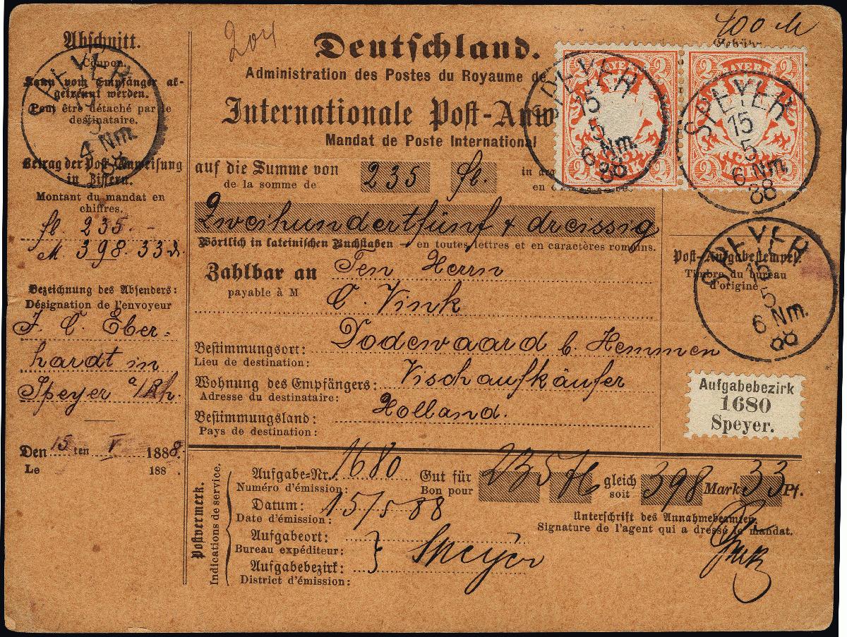| Zusatzinformationen und Suchstichworte: | 376. Auktion Heinrich Köhler 19.-24. April 2021 Los 7172 1876/79, 2 Mark lebhaft rotorange im waagerechten Paar, farbfrisch und gut gezähnt mit klarem "SPEYER 15 5 88" auf kompletter Postanweisung über 235 Gulden an eine Fischgroßhandlung in Hemmen in der niederländischen Provinz Gelderland mit rückseitigen Transitstempeln und Auszahlungsquittung. Eine attraktive und in dieser Form seltene Mehrfachfrankatur. Fotoattest Dr. Helbig BPP (2008) Zuschlag 700,00 EUR |