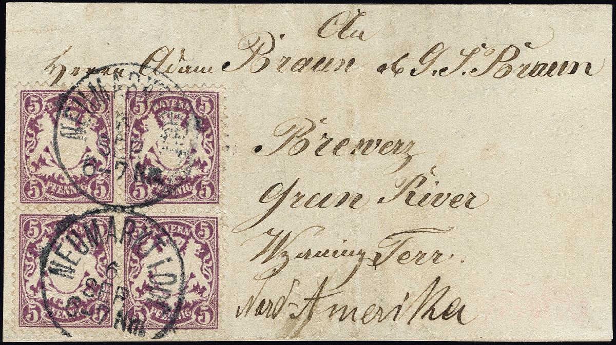 | Zusatzinformationen und Suchstichworte: | 376. Auktion Heinrich Köhler 19.-24. April 2021 Los 7173 5 Pfennig violett im 4er-Block, farbfrisch und gut gezähnt mit EKr. "NEUMARKT i.Opf. 6 SEP." auf kleiner Briefvorderseite in die USA, auf Papier aufgezogen, eine recht seltene Einheit, Fotoattest Dr. Helbig BPP (2000) Ausruf 300,00 EUR |