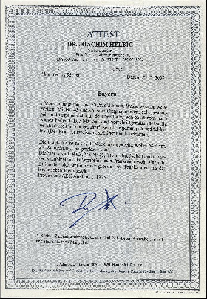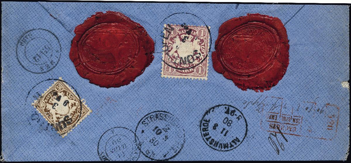 | Zusatzinformationen und Suchstichworte: | 376. Auktion Heinrich Köhler 19.-24. April 2021 Los 7174 50 Pfennig dunkelorangebraun und 1876/79, 1 Mark lebhaftbraunpurpur mit sauberem EKr. "SONTHOFEN 9 3" (1880) auf oben und unten geschnittenem Leinenkuvert als Wertbrief über 96 Mark nach Nimes in Frankreich mit Transit- und Ankunftsstempeln. Ein attraktives Stück mit wohl einzigartiger Frankatur. Fotoattest Dr. Helbig BPP (2008) Ausruf 520,00 EUR |