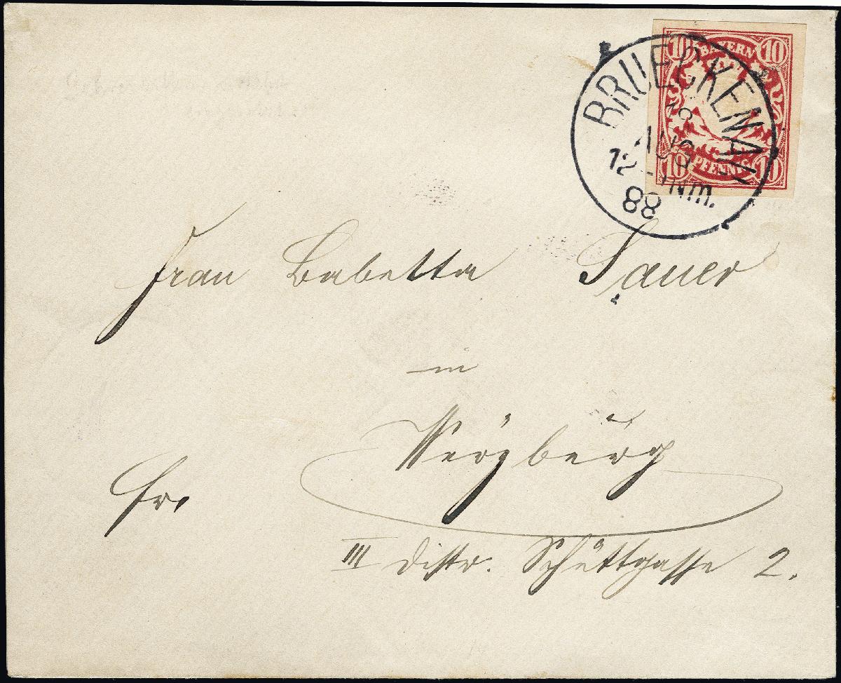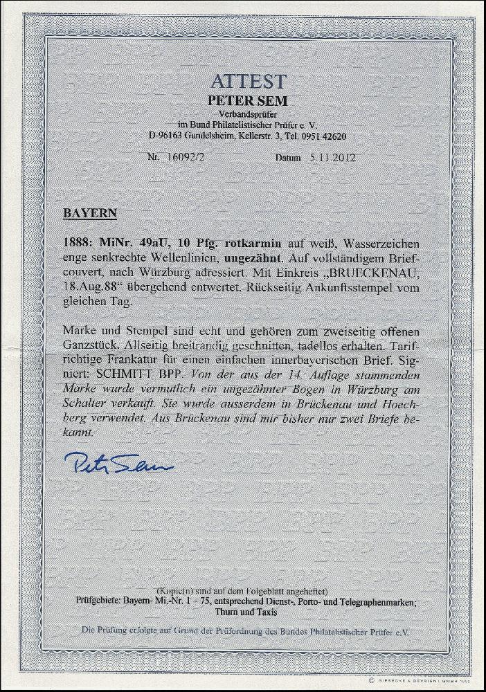 | Zusatzinformationen und Suchstichworte: | 376. Auktion Heinrich Köhler 19.-24. April 2021 Los 7181 10 Pfennig rotkarmin, breitrandig ungezähnt, mit sauber aufgesetztem EKr. "BRUECKENAU 18 AUG. 88" auf kleinem Briefkuvert nach Würzburg mit Ankunftsstempel. Von dieser Abart wurde vermutlich nur ein einziger Bogen unerkannt in Würzburg am Schalter verkauft; einige wenige Stücke sind mit Stempeln von Brückenau und Hoechberg bekannt. Nur ein weiterer Brief aus Brückenau ist registriert. Fotoattest Sem BPP (2012) Zuschlag 1.000,00 EUR |