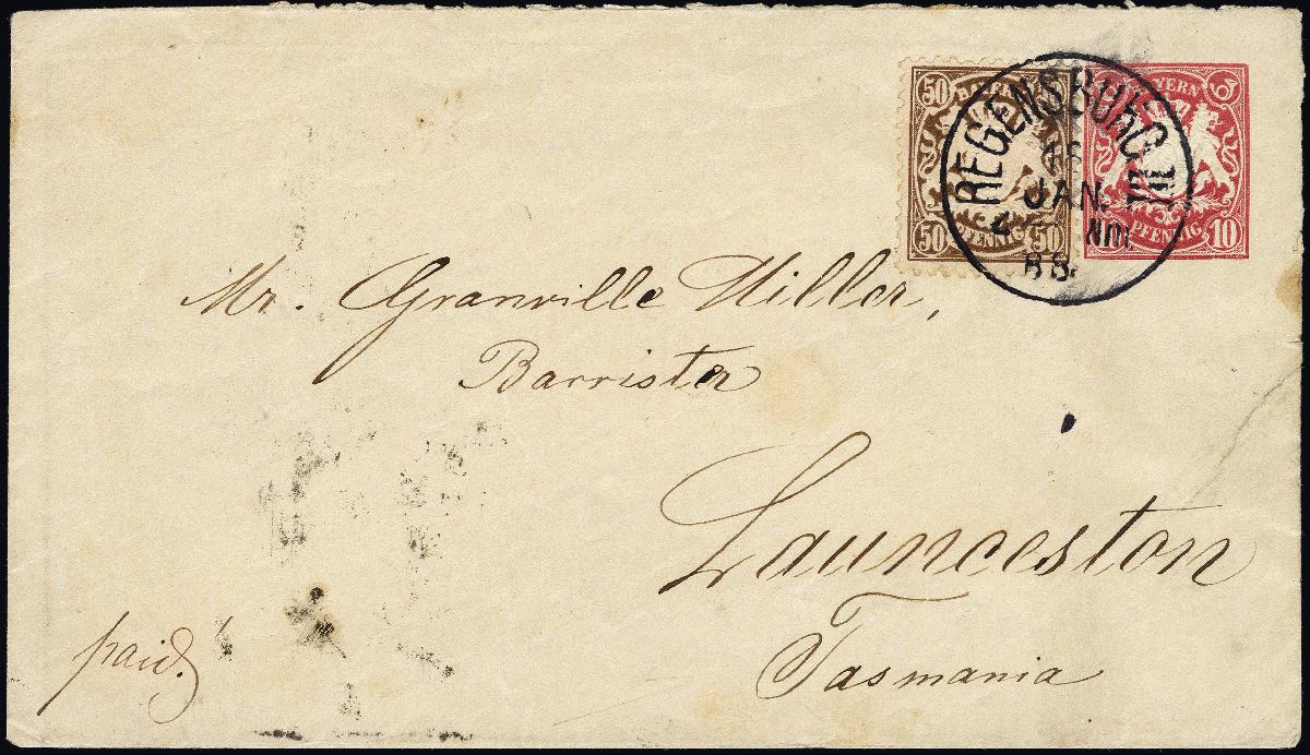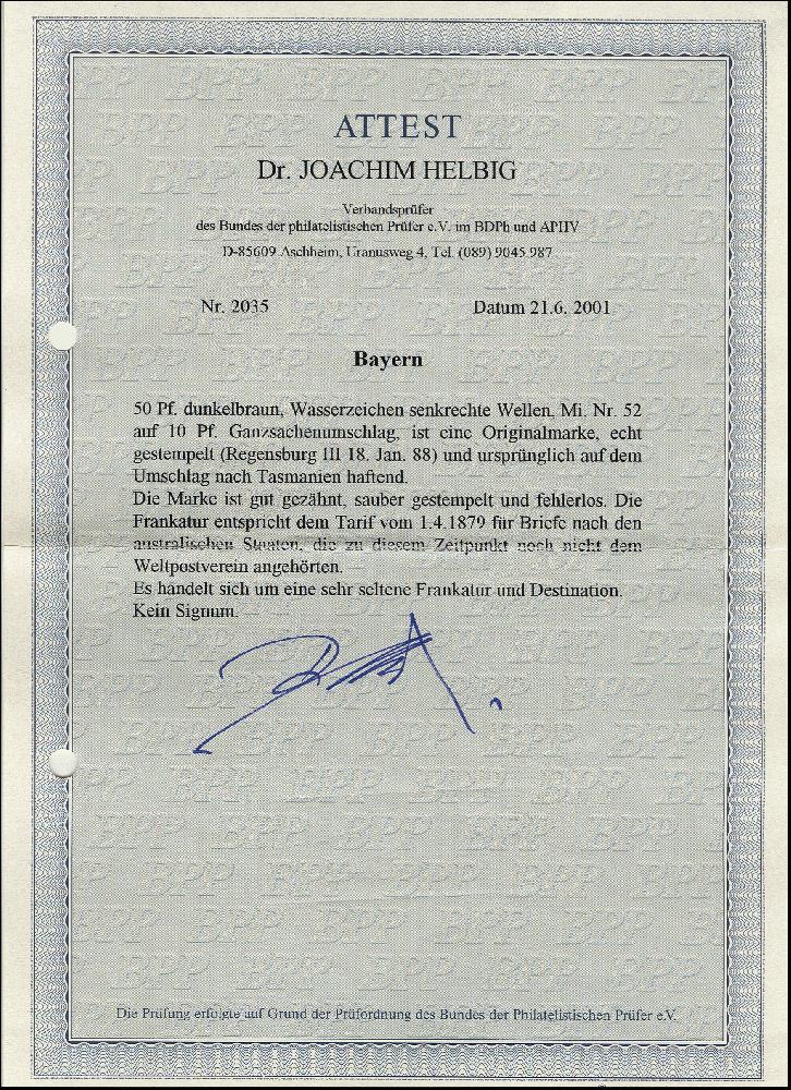 | Zusatzinformationen und Suchstichworte: | 376. Auktion Heinrich Köhler 19.-24. April 2021 Los 7185 1881, 50 Pfennig dunkelorangebraun, farbfrisch und gut gezähnt als Zufrankatur auf Ganzsachenumschlag 10 Pfennig, portogerecht von "REGENSBURG 18 JAN. 88" nach Launceston in Tasmanien, Australien mit Ankunftsstempel vom 28. Februar. Das Kuvert rechts verklebter Einriß und kleiner Teil der Rückklappe fehlend, sonst in - insbesondere für diese Destination - gute Erhaltung. Fotoattest Dr. Helbig BPP (2001) Zuschlag 540,00 EUR |