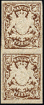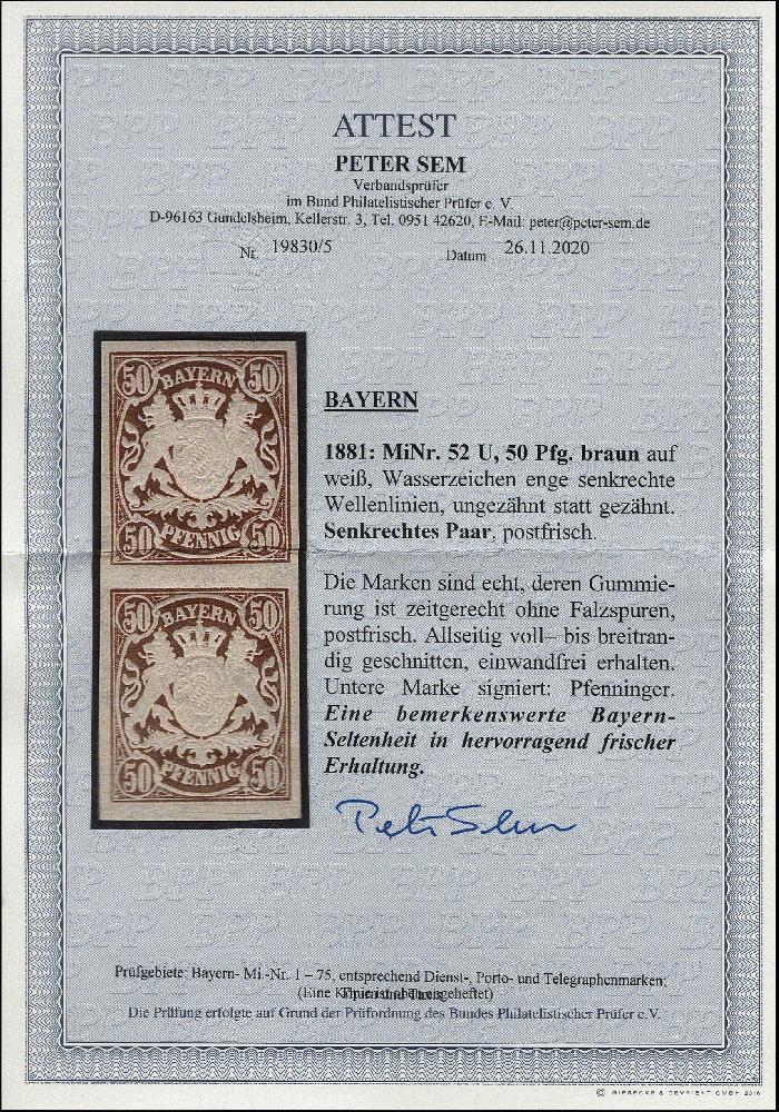 | Zusatzinformationen und Suchstichworte: | 376. Auktion Heinrich Köhler 19.-24. April 2021 Los 7186 50 Pfennig braun ungezähnt im senkrechten Paar, farbfrisch und allseits breitrandig, postfrisch in einwandfreier Erhaltung, außerordentlich selten, die untere Marke signiert Pfenninger, Fotoattest Sem BPP (2020) Zuschlag 4.600,00 EUR |
