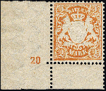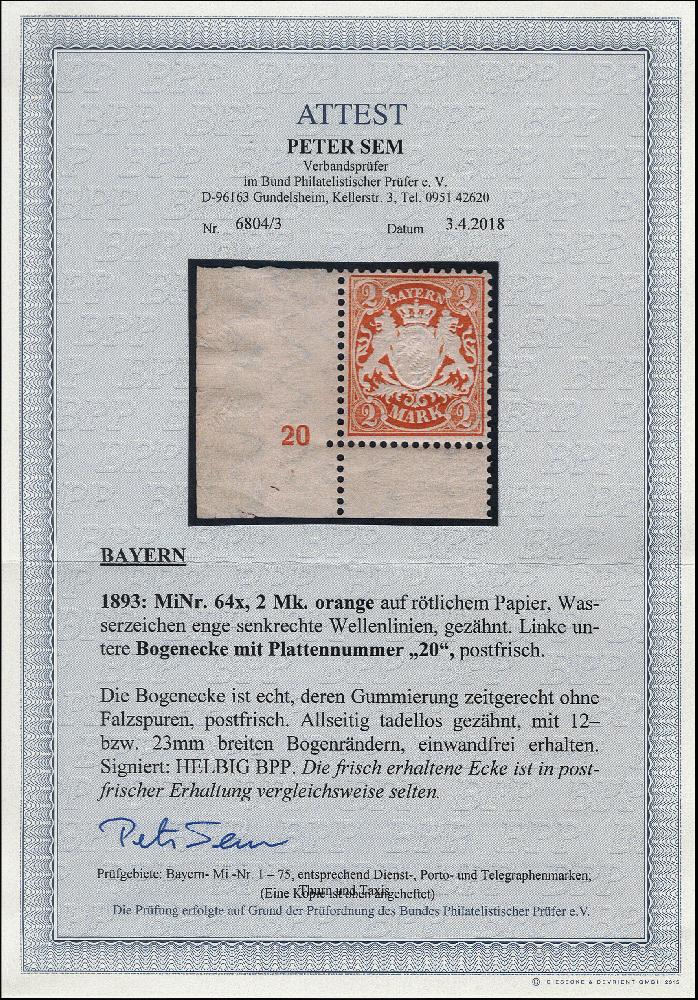 | Zusatzinformationen und Suchstichworte: | 376. Auktion Heinrich Köhler 19.-24. April 2021 Los 7196 2 Mark orange auf rötlichem Papier, linke untere Bogenecke mit Plattennummer "20", postfrisch, im unteren Seitenrand kleiner Einriß, sonst einwandfrei; signiert Helbig BPP und Fotoattest Sem BPP (2018) Zuschlag 520,00 EUR |