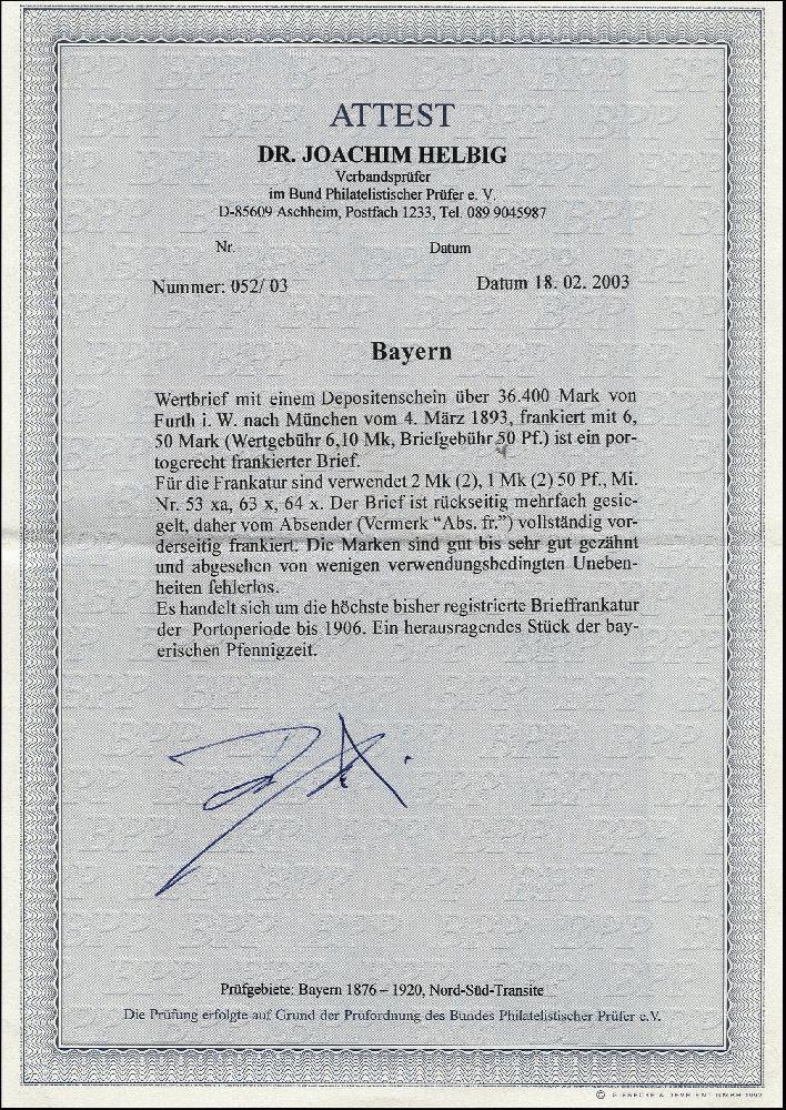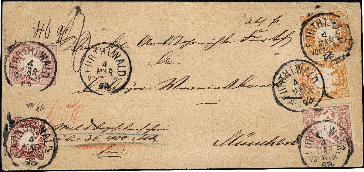 | Zusatzinformationen und Suchstichworte: | 376. Auktion Heinrich Köhler 19.-24. April 2021 Los 7197 2 Mark orange, 2 Einzelstücke zusammen mit 1881, 1 Mark lila auf mattorangeweißem Papier und Einzelwert 1890, 50 Pfennig lilabraun auf Wertbriefhülle (Inhalt Depositenschein über 36.400 Mark) von "FURTH I. WALD 4 MÄR 99" nach München mit Ankunftsstempel, bis auf kleine Beförderungsspuren einwandfrei. Eine seltene vorderseitige Frankatur, laut Fotoattest Dr. Helbig BPP (2003) bis dato die höchste registrierte Brieffrankatur der Portoperiode bis 1906 Zuschlag 1.350,00 EUR |
