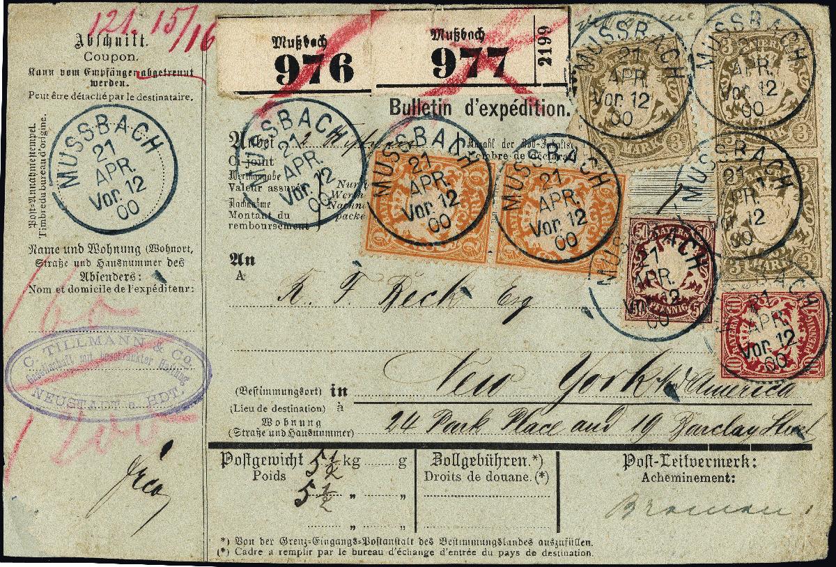 | Zusatzinformationen und Suchstichworte: | 376. Auktion Heinrich Köhler 19.-24. April 2021 Los 7203 1900, Wappen 3 Mark braunoliv auf mattorangeweißem Papier, 3 Einzelstücke mit senkrechtem Paar 2 Mark orange mit Zufrankatur, alle vorderseitig geklebt auf kompletter Paketkarte von "MUSSBACH 21 APR. 00" nach New York, die 10 Pfennig eckrund und einige leichte Zahnunregelmäßigkeiten, die Karte an den Rändern etwas fehlerhaft; eine selten hohe Frankatur, Fotoattest Dr. Helbig BPP (2000) Zuschlag 480,00 EUR |