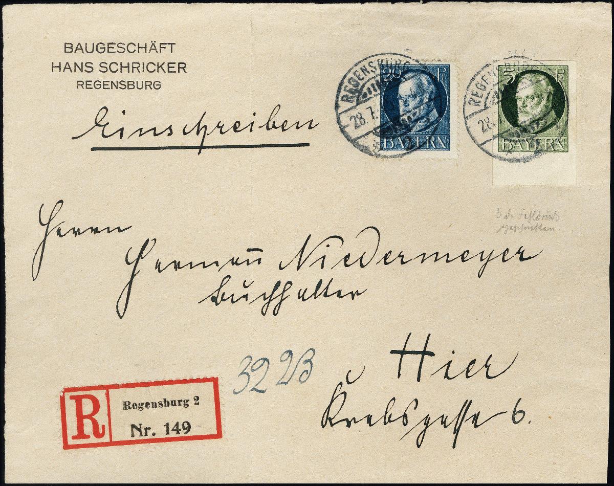 | Zusatzinformationen und Suchstichworte: | 376. Auktion Heinrich Köhler 19.-24. April 2021 Los 7214 1914, Ludwig Friedensdruck 5 Pfennig, breitrandig ungezähntes Unterrandstück zusammen mit 20 Pfennig ultramarin auf Orts-R-Brief-Vorderseite von "REGENSBURG 28.7.15", senkrechte Faltung außerhalb der Frankatur, Fotoattest Dr. Helbig BPP (2010) Zuschlag 320,00 EUR |